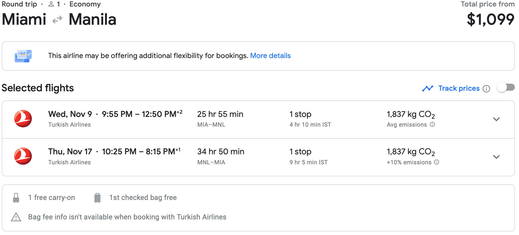 One last one -- we found a nice price on a Miami (MIA) to Manila flight on Turkish Airlines in early November. Your first checked bag with this fare is free, adding to the savings.