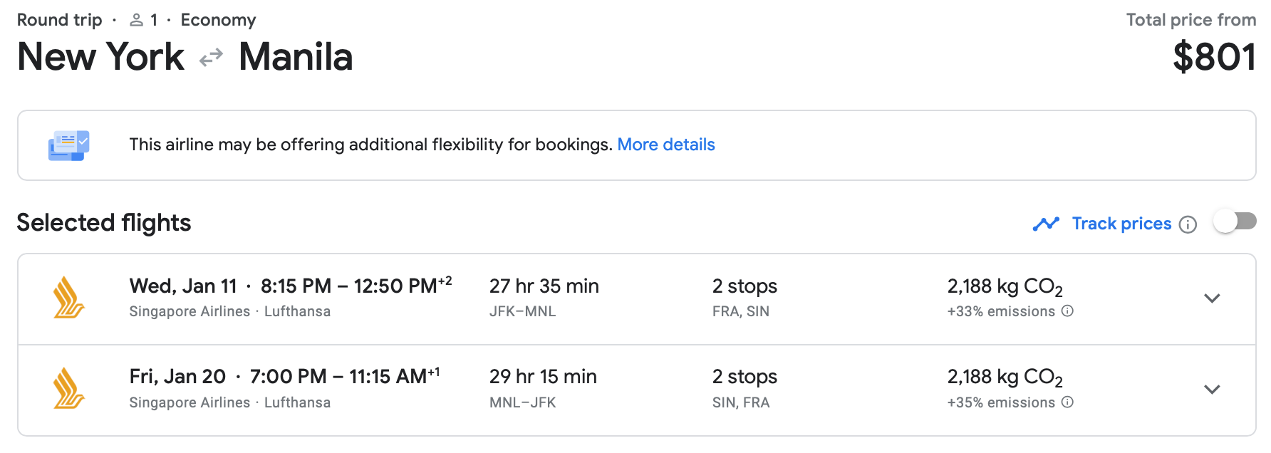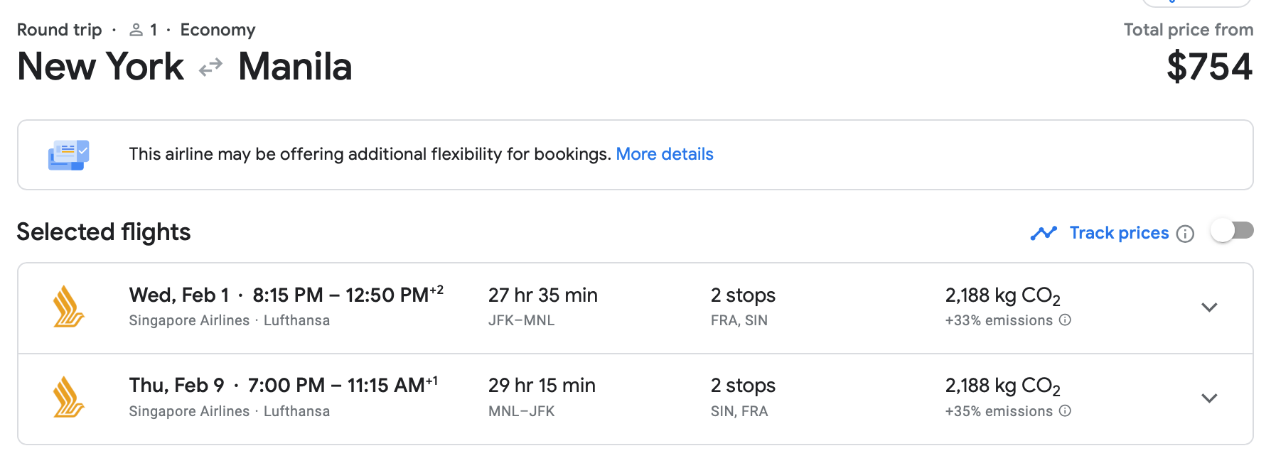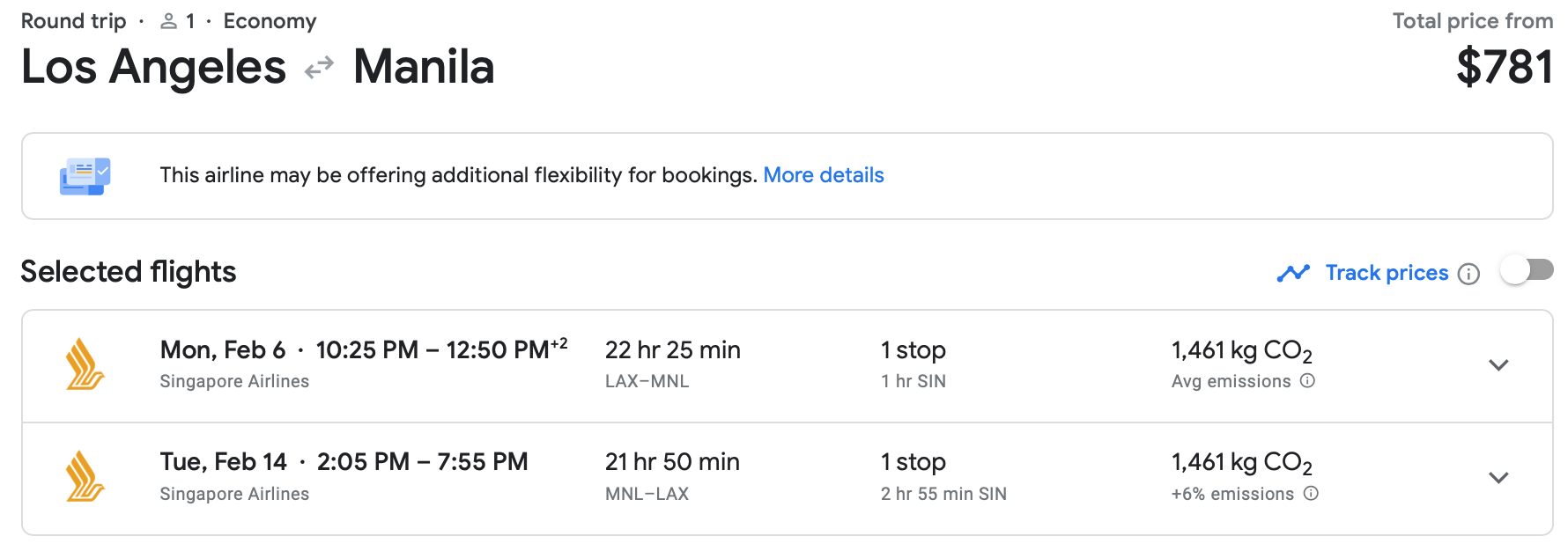 Let's start with a sweet fare from Los Angeles (LAX) to Manila (MNL) in February – only $781 for a round-trip ticket on Singapore Air. Aside from the major reduction in price for this itinerary, we also liked that the layovers weren't very long. A few of the best prices we found in this deal come with lengthy layovers. This one doesn't.