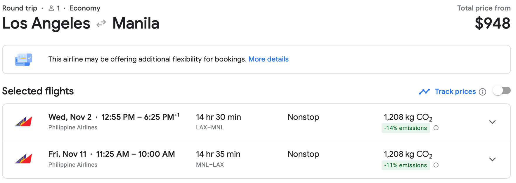 We also found some nice deals from L.A. to Manila in November, like this Philippine Airlines ticket for $948. While it's almost $200 more than the fare we showed you above, this one is nonstop on a Boeing 777. So if flying direct is worth a few extra bucks -- and this is still a big markdown from typical prices -- then this one may appeal to you.