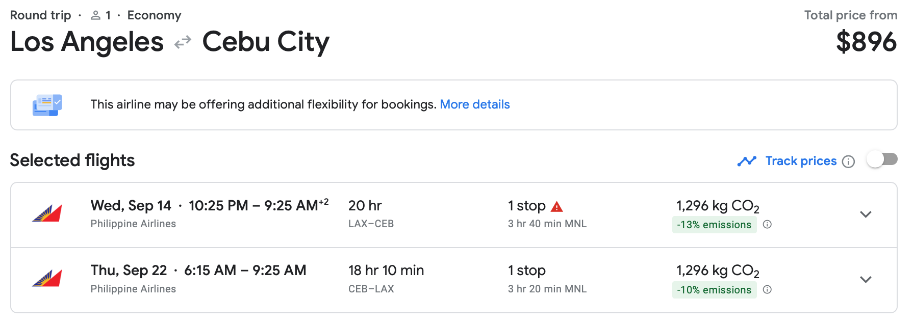 There is quite a lot of availability on sale tickets from Los Angeles to Cebu City (CEB) in the fall. Here's a nice round-trip ticket on Philippine Airlines for just $948 in September. We found similar prices in October and November, but a lot of those itineraries had two and even three stops.