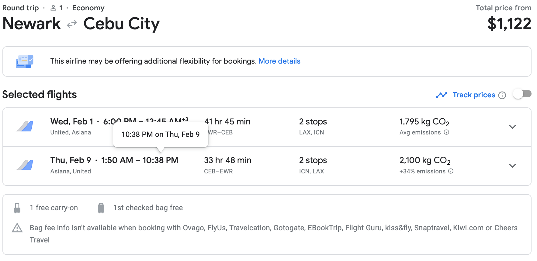 Newark (EWR) to Cebu is available on United for $1,122 round trip. The downside if you're flying from Newark to the Cebu province is you're almost assured of having to make two stops each way if you want to take advantage of the sale prices. One silver lining? United's ticket comes with a free carry-on and your first checked bag is free.