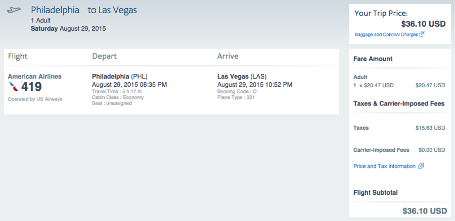 Philadelphia to Las Vegas for $36 on American (earns 2,176 EQMs):