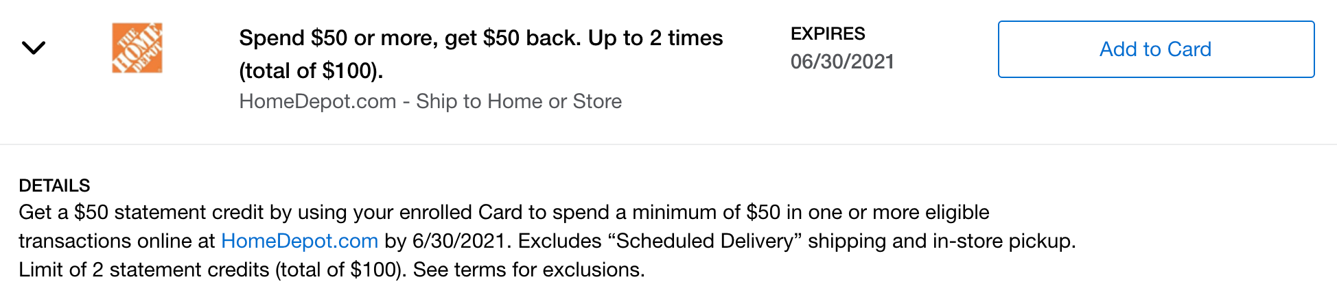 Many people who have The Platinum Card® from American Express received an Amex Offer at the beginning of the year that awards $50 back on up to two purchases of $50 or more when you shop online at The Home Depot. That means you could save $100 with two $50 orders made at The Home Depot's website by June 30, 2021, and have zero out-of-pocket expenses.