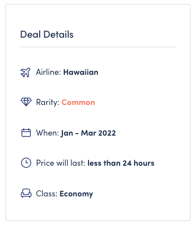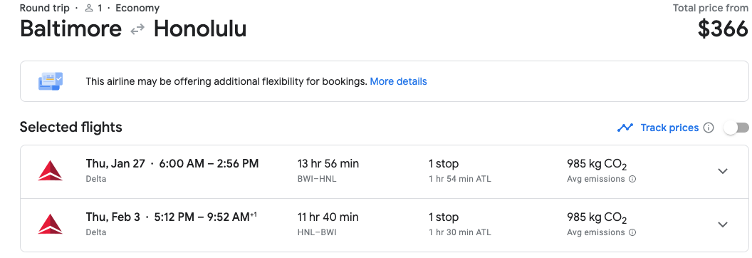 Other flights can be found in this deal via Hawaiian and American in their economy classes. A checked bag costs $30-$35 each way on all mentioned airlines.