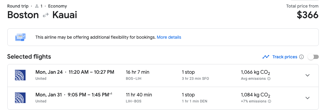 A round-trip flight from BOS to LIH is available on United for less than $400 in late January, ideal for that post-holiday slump.