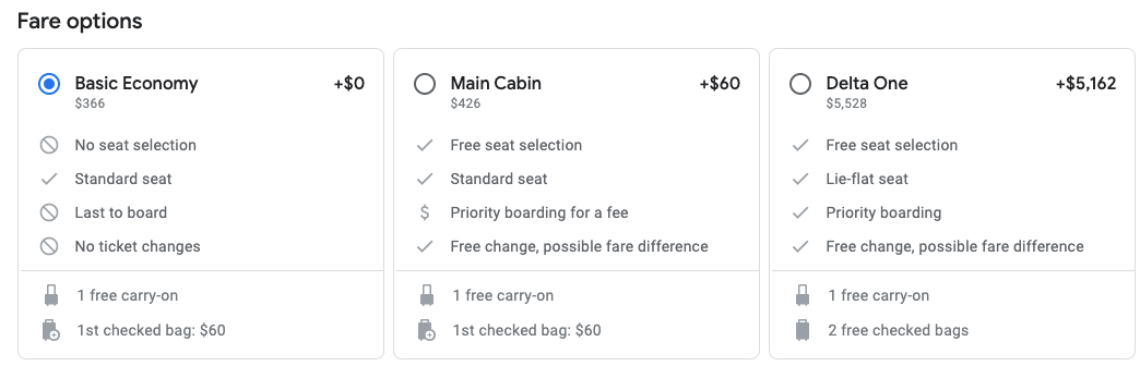 Unlike United, Delta's basic economy includes one free carry-on, but you'll have to pay to select your seat.