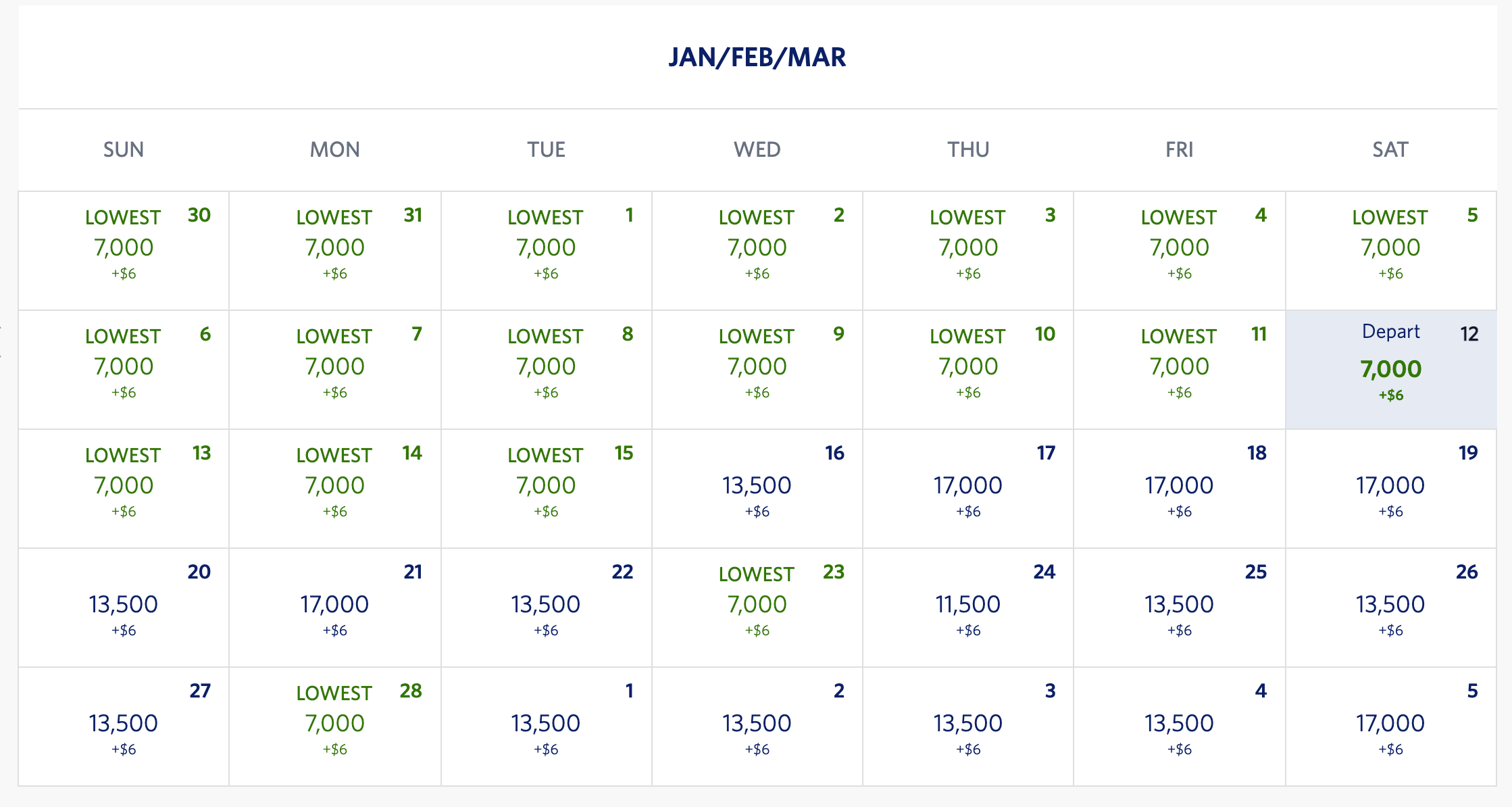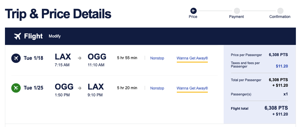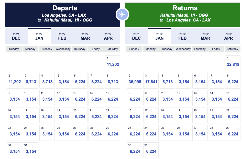 To browse this deal, head to Southwest.com, select "Points" and then click "Search" based on your desired dates of travel. Be sure to filter nonstop fares only. From the low-fare calendar, I found a nonstop flight from LAX to OGG in January for 6,308 Rapid Rewards points total.