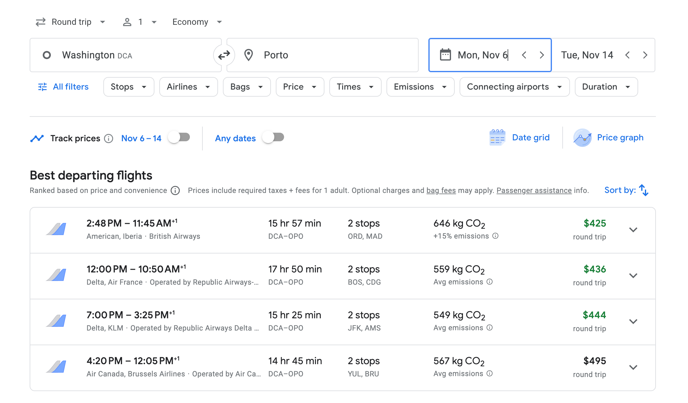 You can travel from Ronald Reagan Washington National Airport (DCA) to Porto Airport (OPO) in November for just $425. The cheap price comes with a catch, though: You'll have two layovers. Below, you can see the departing flight stops in Chicago and then Madrid.