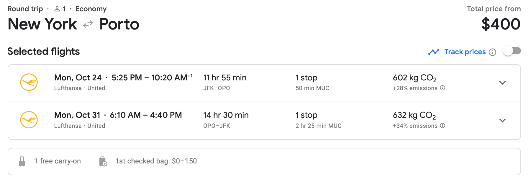 We found a lot of availability for this route at this price point, like this itinerary on Lufthansa in late October.