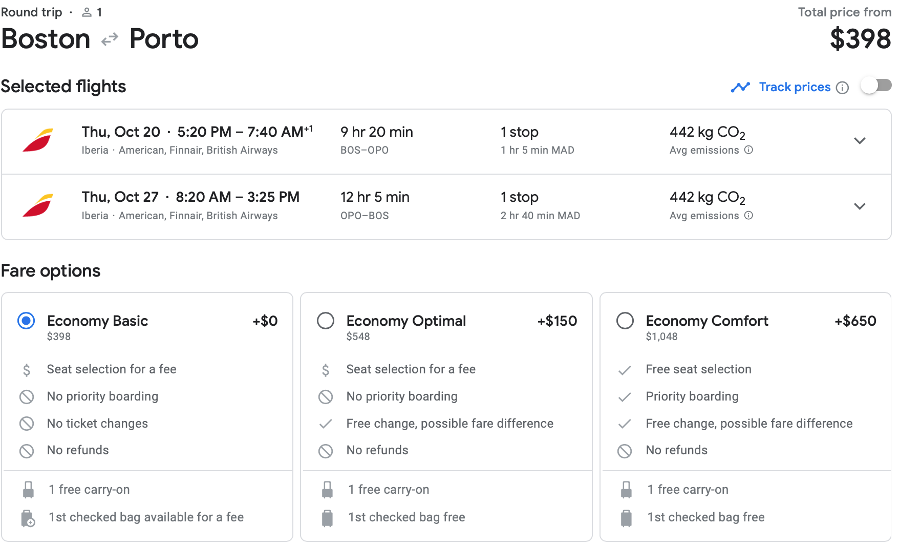 Flights out of Boston bound for Portugal are also available at a discount. You can fly Iberia out of Boston Logan International Airport (BOS) to Porto in the fall for $398 round-trip. We saw lots of availability for this route between October and December.