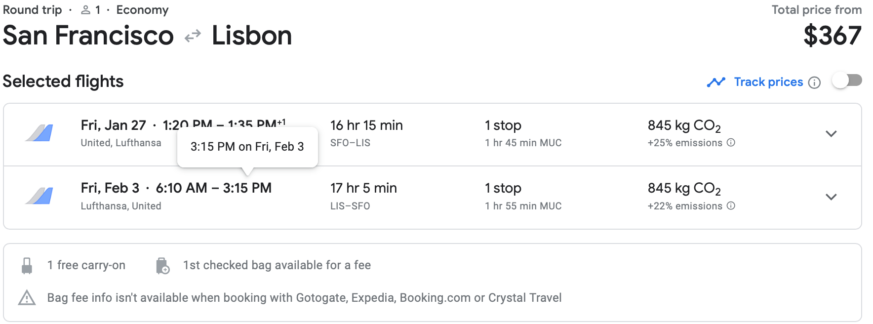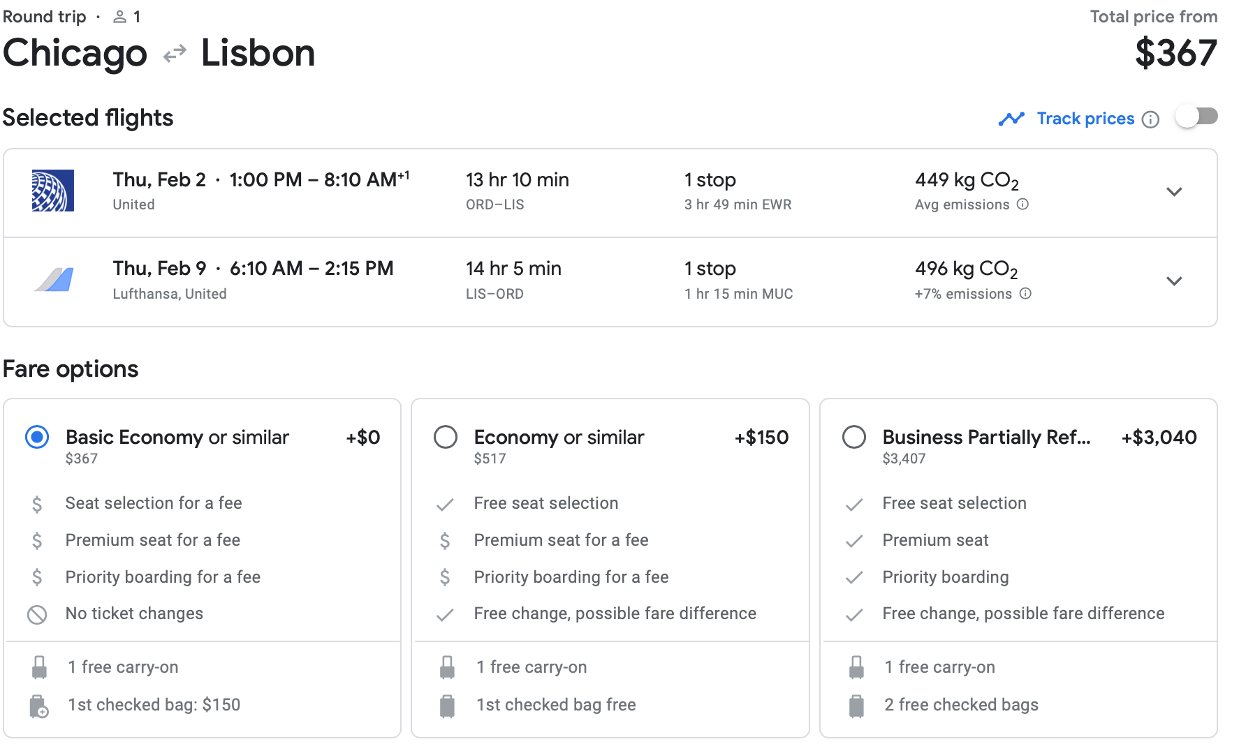 What about Lisbon deals, you ask? If you live in the Midwest, you can fly United out of Chicago's O'Hare International Airport (ORD) to Lisbon's Humberto Delgado Airport (LIS) in early February for $367 round-trip. With United's most restrictive fare, you get a free carry-on, but a checked bag will cost you $75 each way.