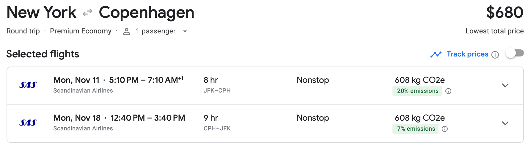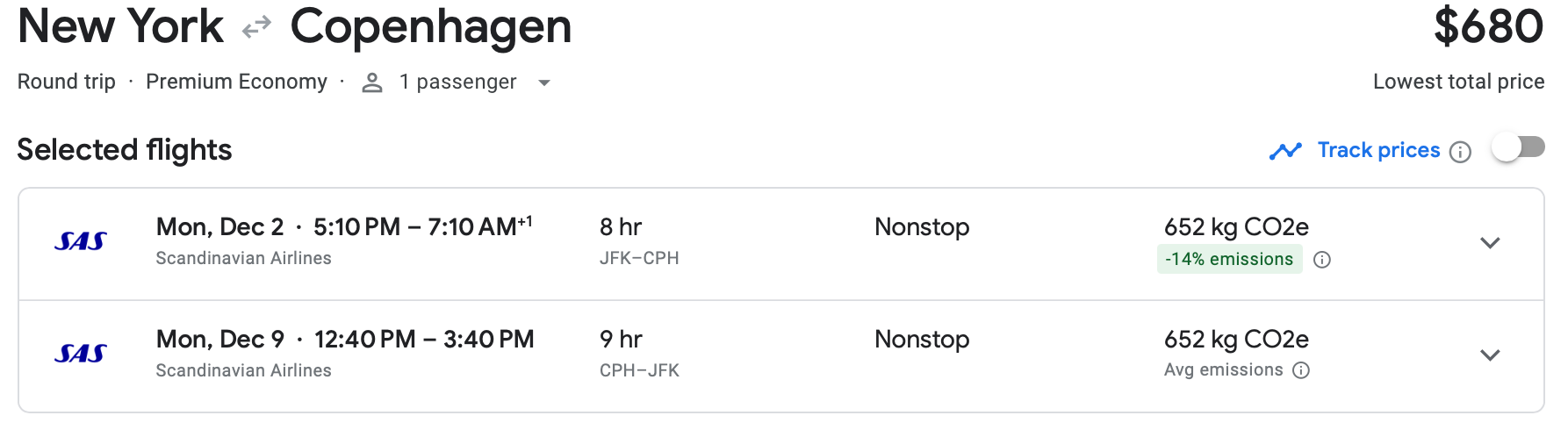 We found the same solid price for a nonstop premium economy fare in December from New York City to Copenhagen.