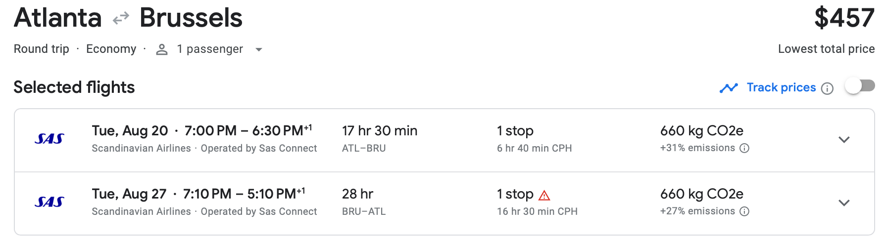 As we told you above, SAS also had some nice markdowns on economy tickets in this sale. Here are a couple we found to Belgium's capital: A late-August round-trip flight from Atlanta to Brussels for only $457.