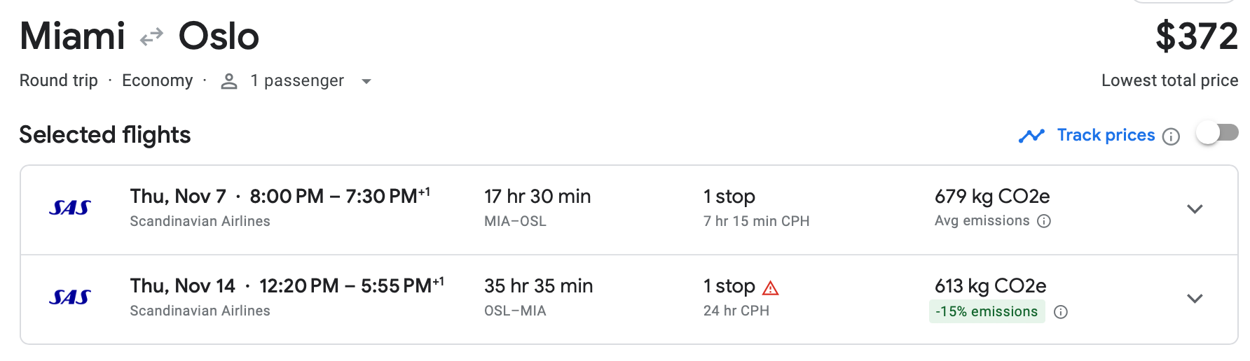 Here's one last economy-tier fare to spotlight: This ticket from Miami to Oslo is just $372 round-trip, an absurdly cheap price for this flight.