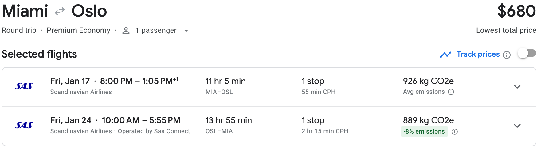 Planning trips almost a year in advance isn't for everyone, but there are some fares we found in January 2025 in this deal that make the long wait well worth it. For example, we found round-trip flights from Miami to Oslo for $680. That's a really good price for a premium economy seat on this route.