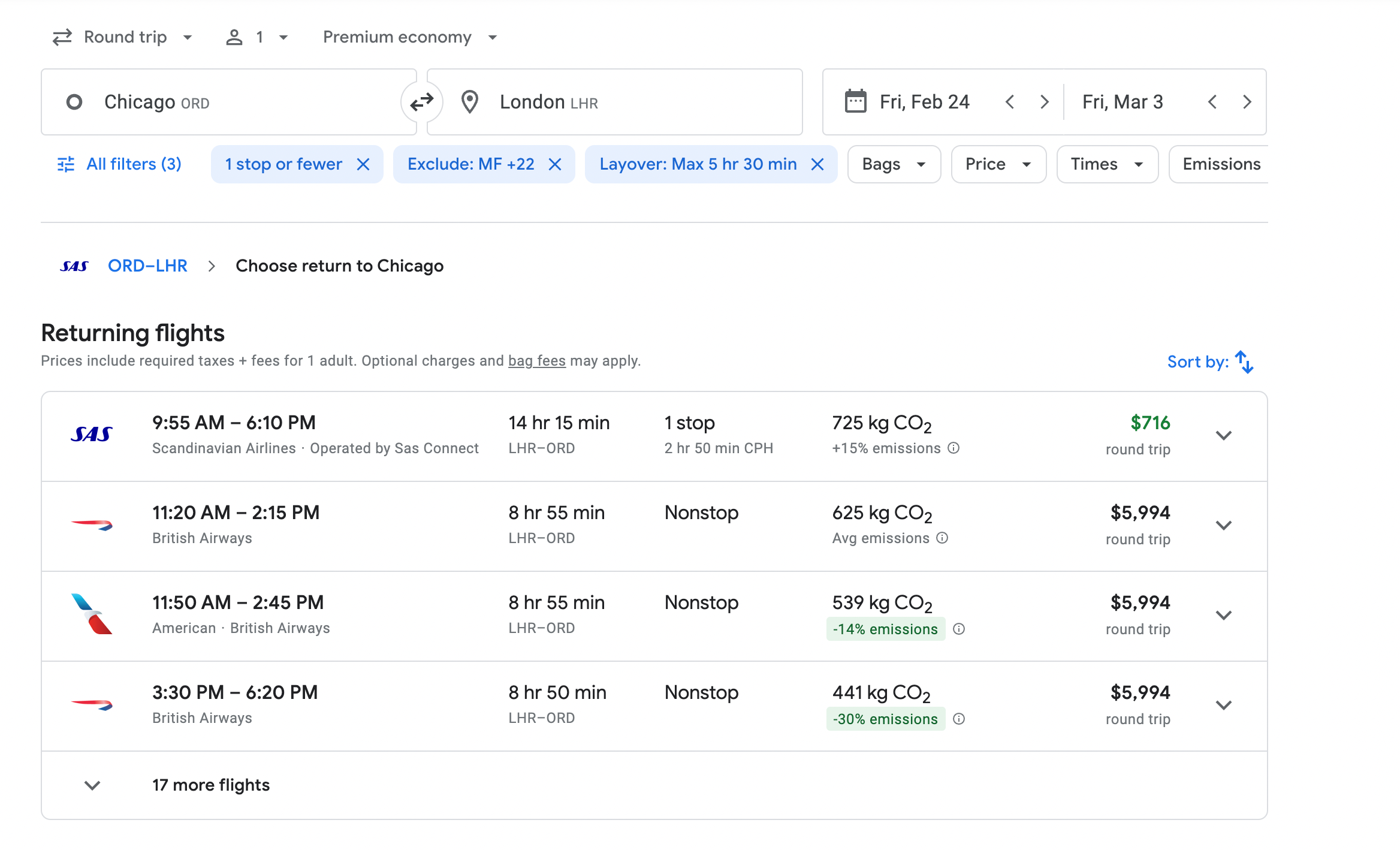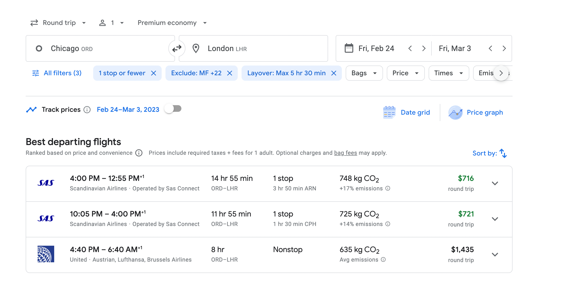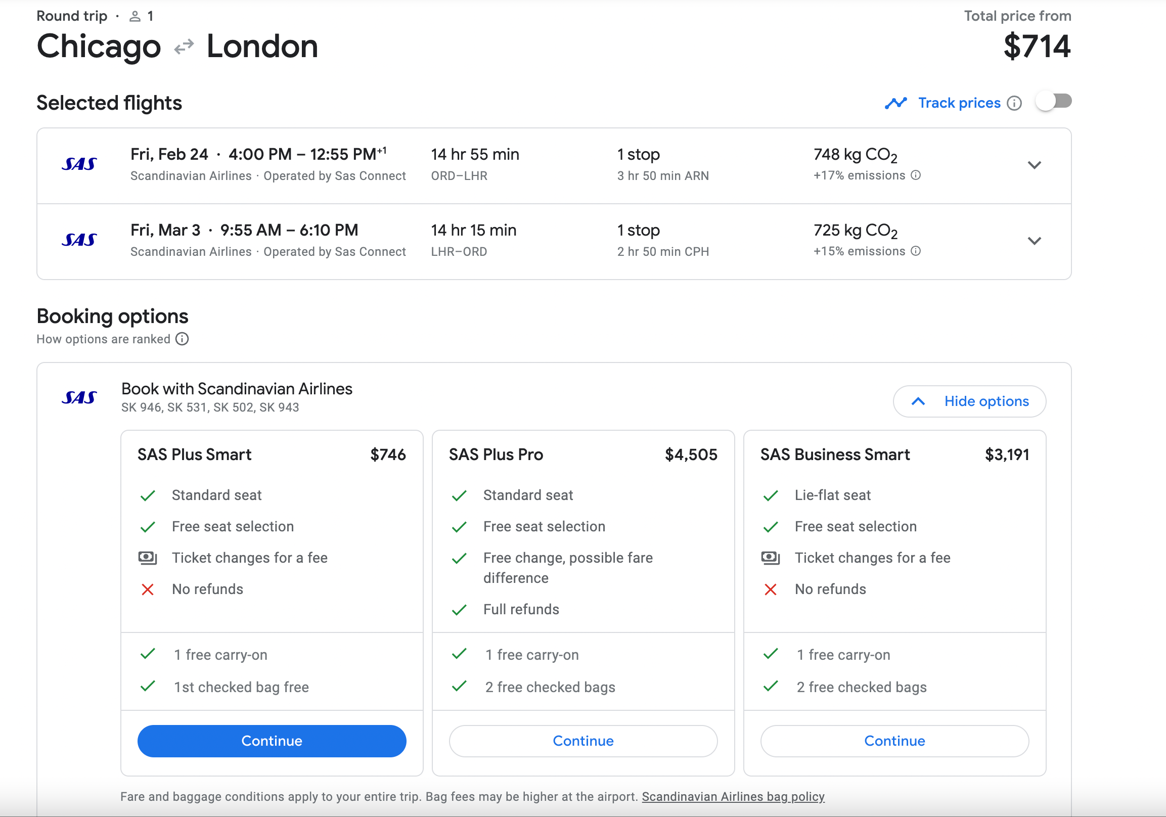 Remember that sometimes Google Flights shows lower prices than what's advertised on the airline's website due to third-party options. In this case, Google Flights said the cheapest available flight from London to Chicago was $714, but if you were to book on the SAS website, it's actually $746. The $714 sticker price is from a third-party booking site.