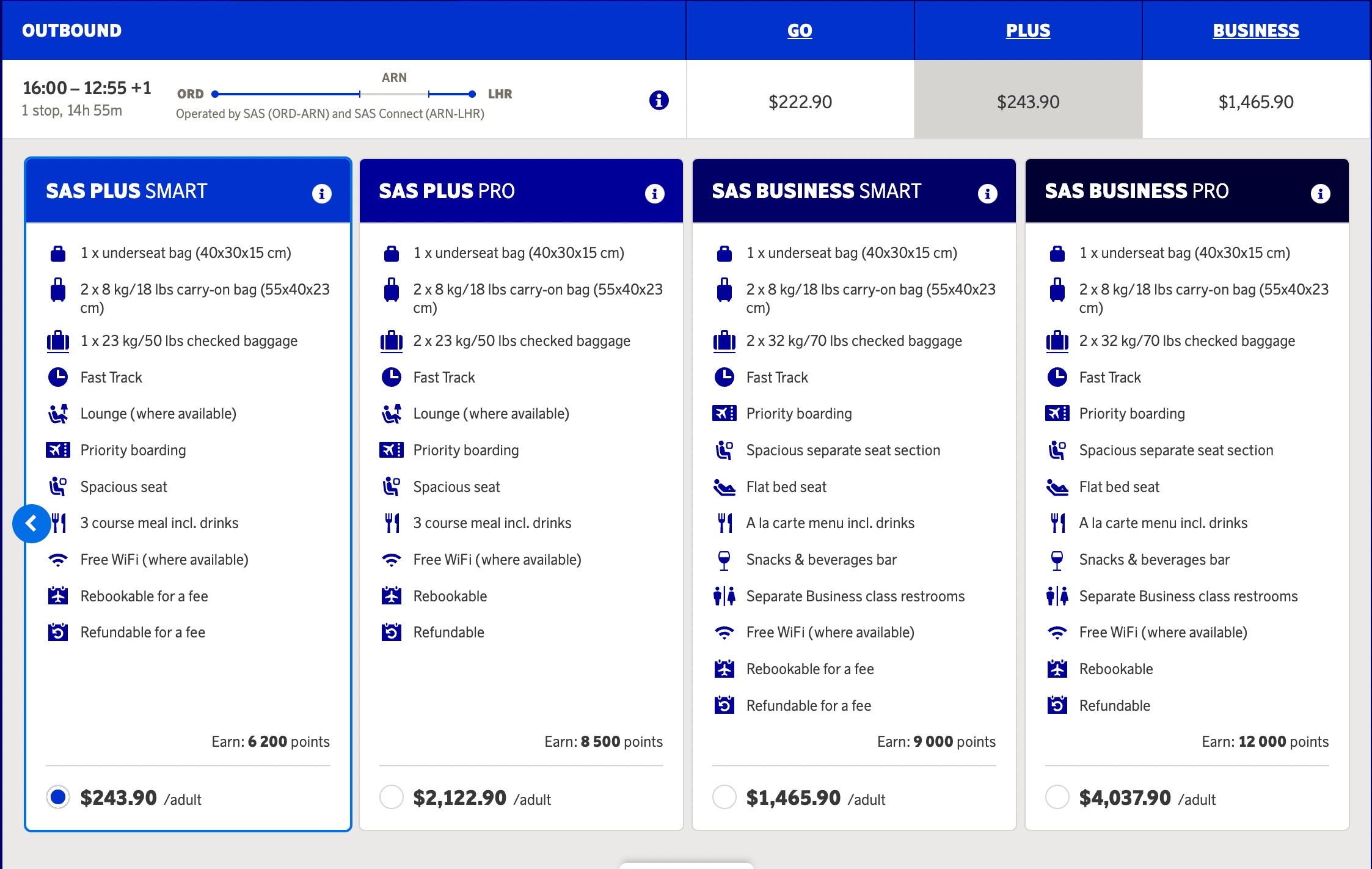 Since these deals to Europe are for premium economy, you'll notice fewer restrictions compared to basic economy. SAS Plus Smart fares include seat selection, one personal item, a carry-on and checked luggage. The fare also includes priority boarding, free Wi-Fi and a three-course meal.