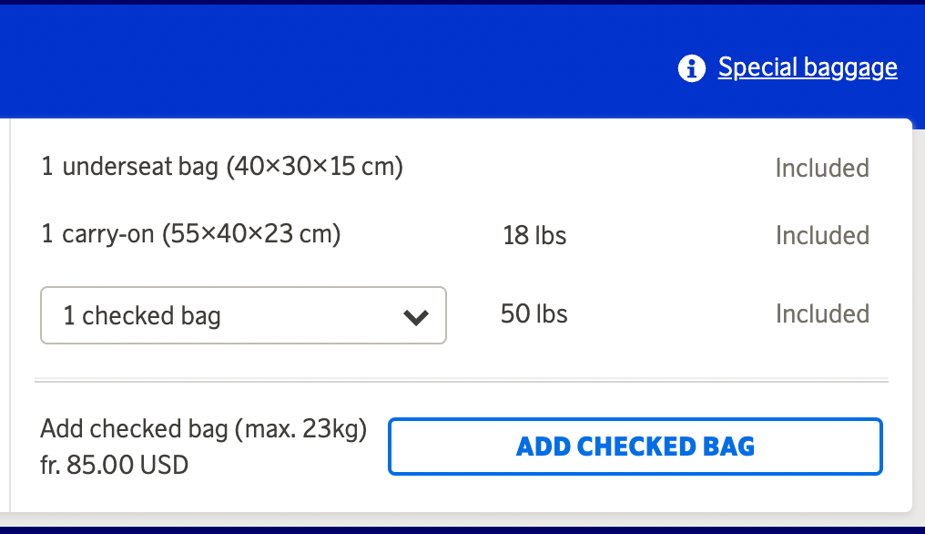 If you'd like to add another checked bag, SAS charges an additional $85 fee each way, so you'd end up paying $170 to check two bags for your trip.