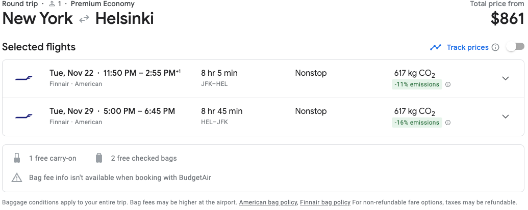 Given the nature of this deal, I would start your search on Google Flights, filtering results based on your departure airport and final destination. For example, you would find this round-trip flight from JFK to HEL over Thanksgiving for $883. Although Google Flights advertises this flight as being available for $861, that price reflects booking through a third-party site. We recommend paying more to book directly with the airline for more flexibility should you need to make changes down the line or have any issues with your flight.