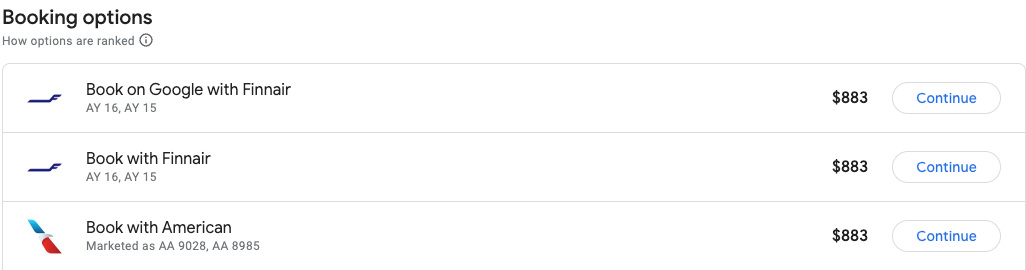 You'll notice this flight is available to book through both Finnair and American for the same price. The flight will be operated by Finnair with an American codeshare, regardless of which airline you book through.
