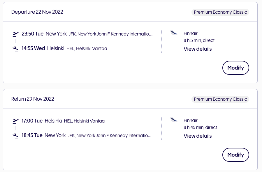 For the sake of this story, I will demonstrate how to book with Finnair to explore its premium economy fare. This fare class offers passengers one free carry-on, two free checked bags, a three-course main meal, large entertainment screens, spacious seats and footrests. However, unlike premium economy on other carriers such as American, Finnair does not offer premium boarding or check-in, nor does it provide free seat selection.