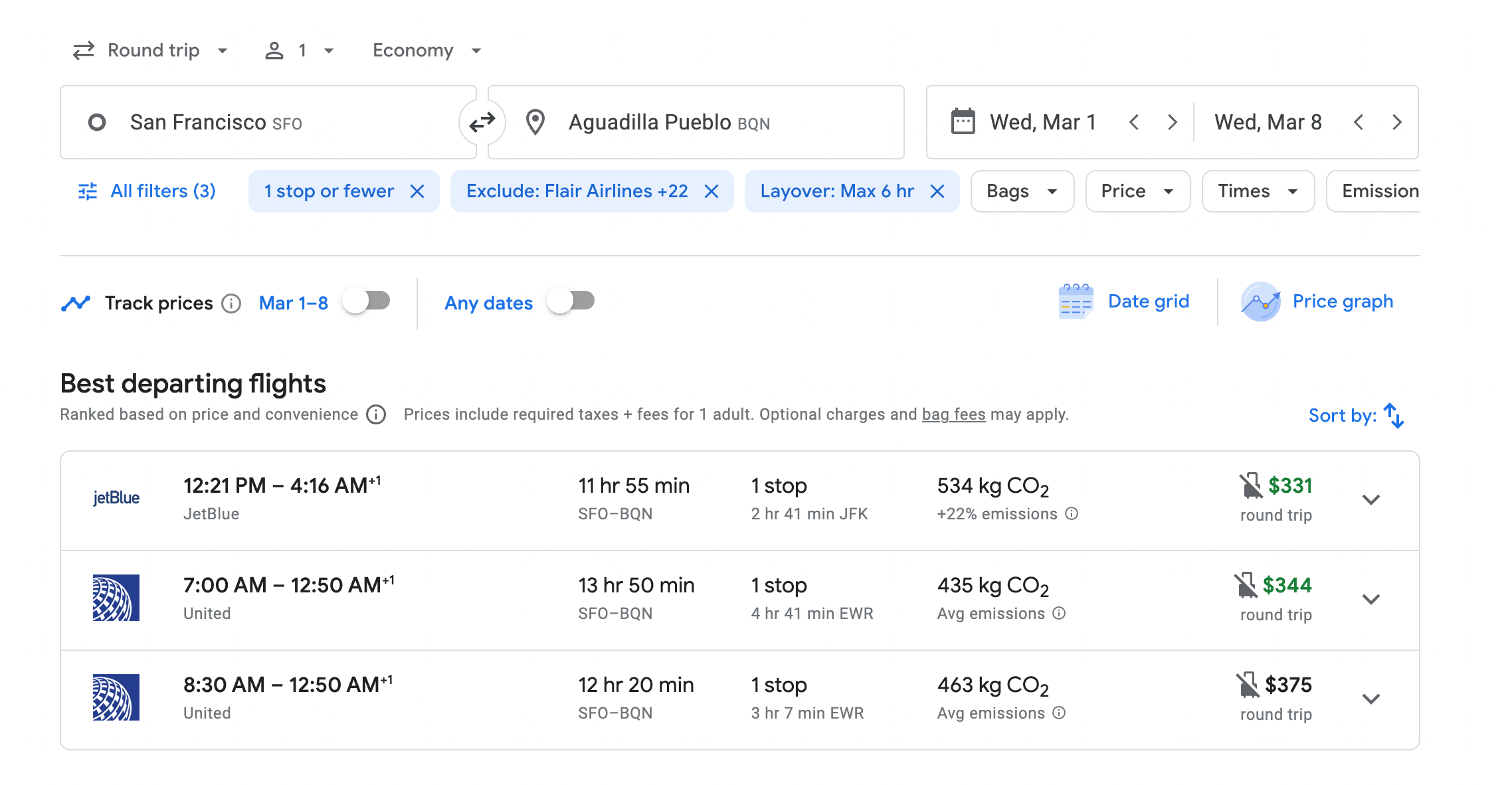 Given the ample availability across many major U.S. airports, now couldn't be a better time to book those flights to Puerto Rico. For a flight taking off from San Francisco to Aguadilla Pueblo, Google Flights shows JetBlue and United both have marked-down flights. The JetBlue flight costs $331, and the United one is slightly more expensive at $344.