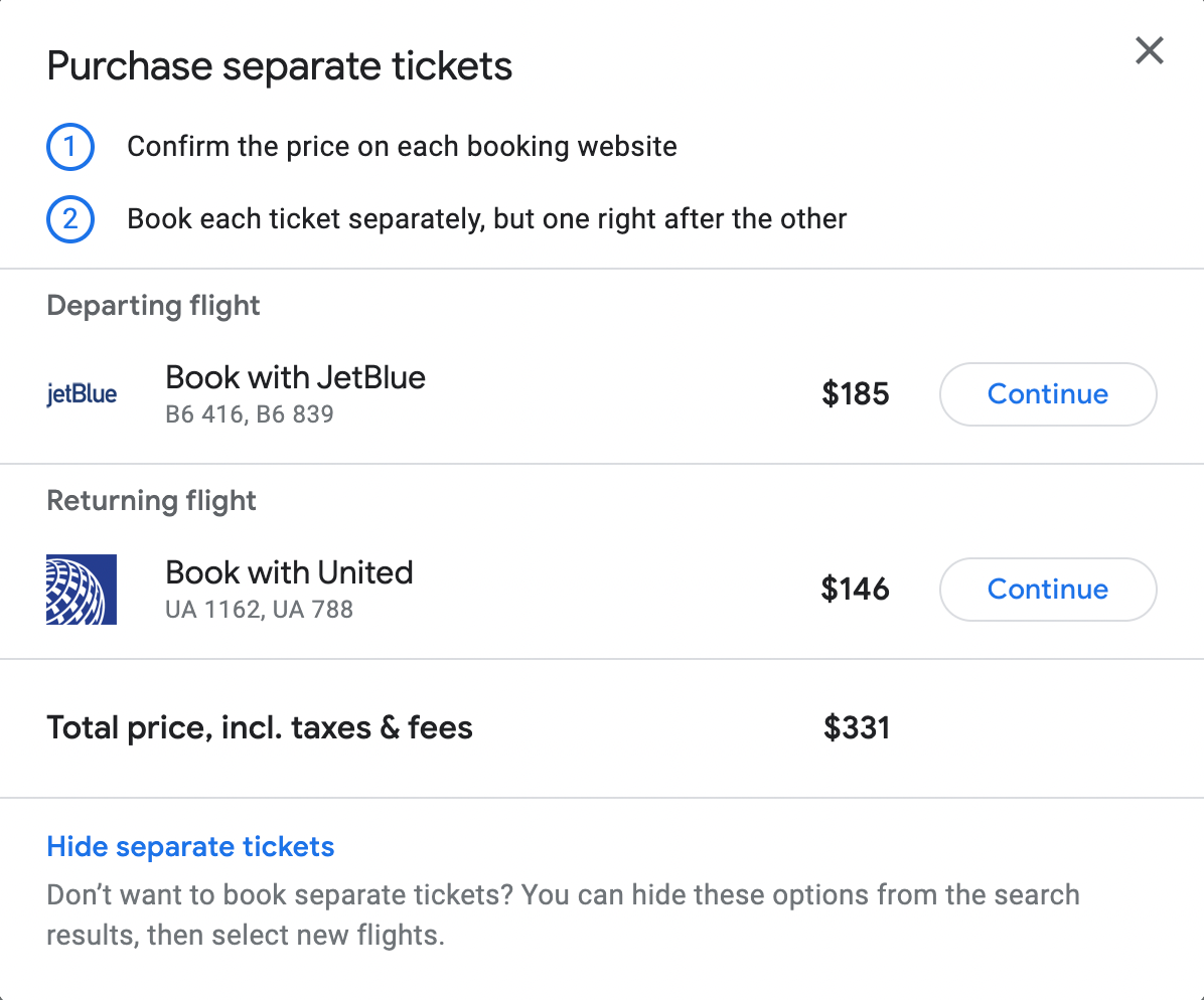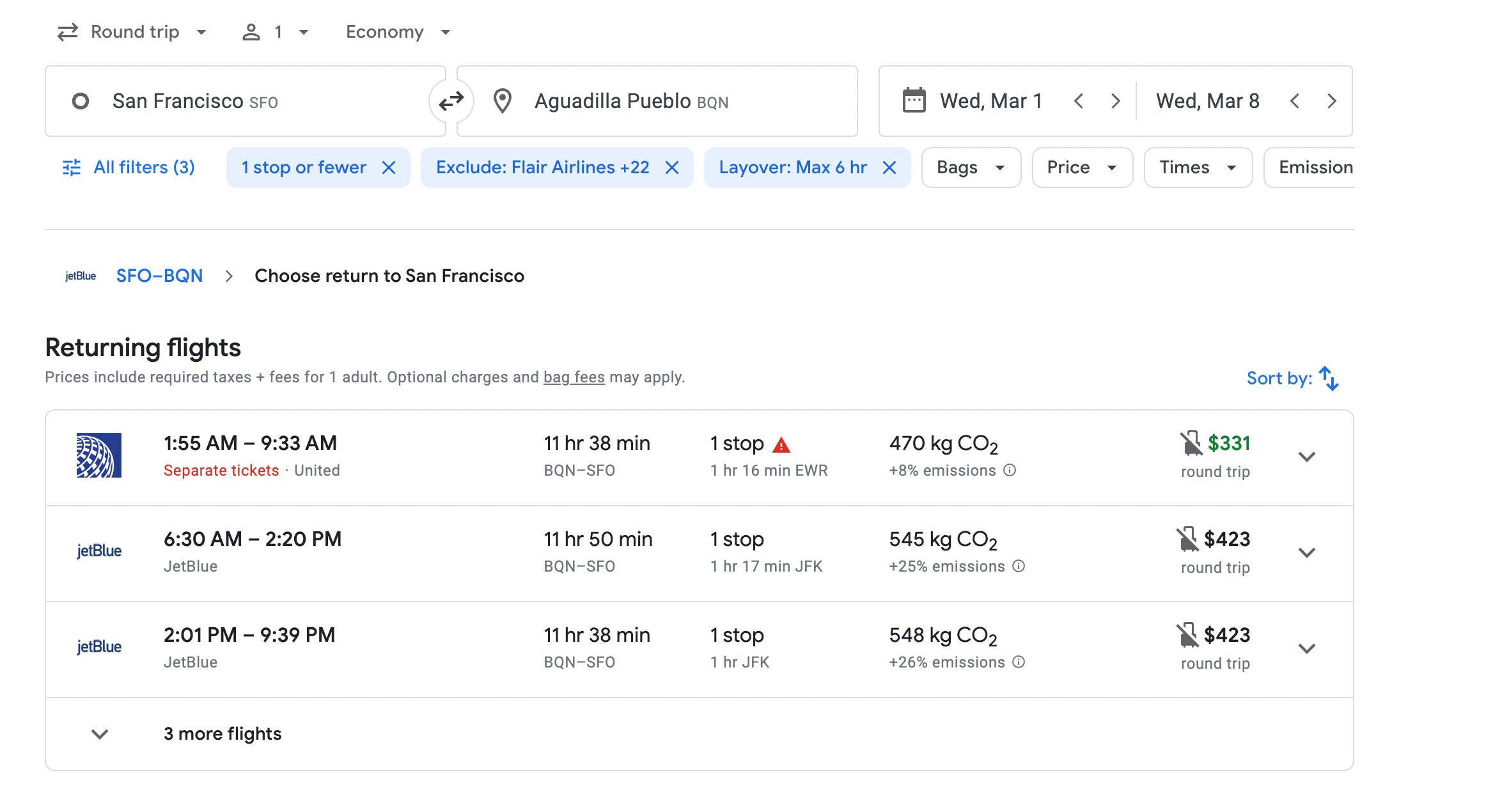 Keep in mind, however, that if you decide to book your departing flight with JetBlue, Google Flights will recommend booking your returning flight to San Francisco with United to keep the round-trip fare at $331.