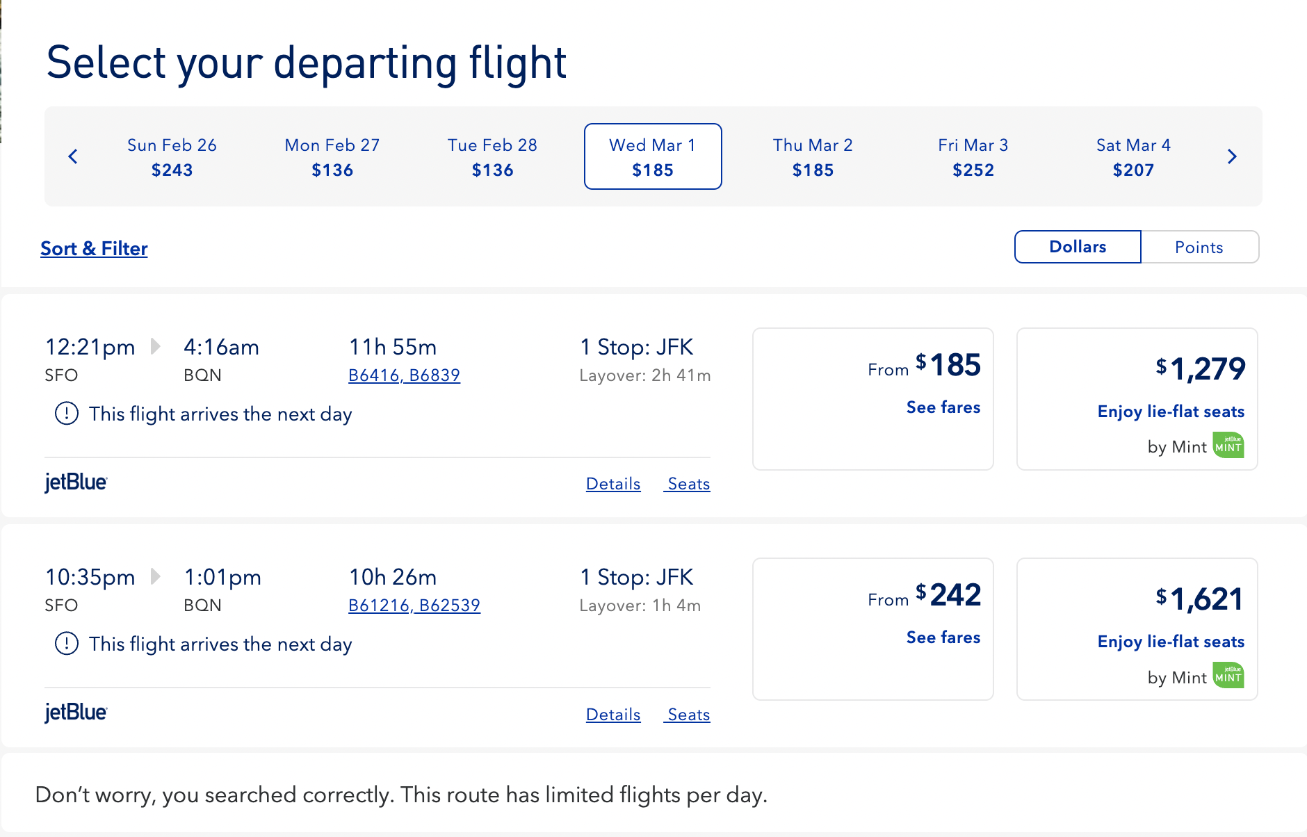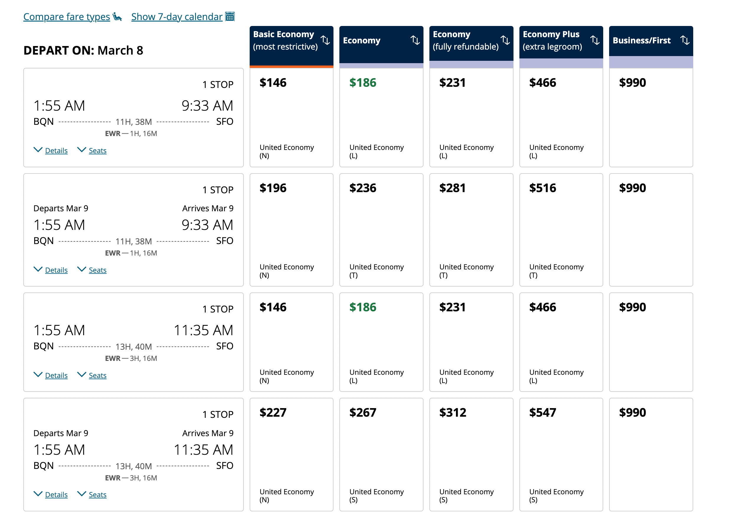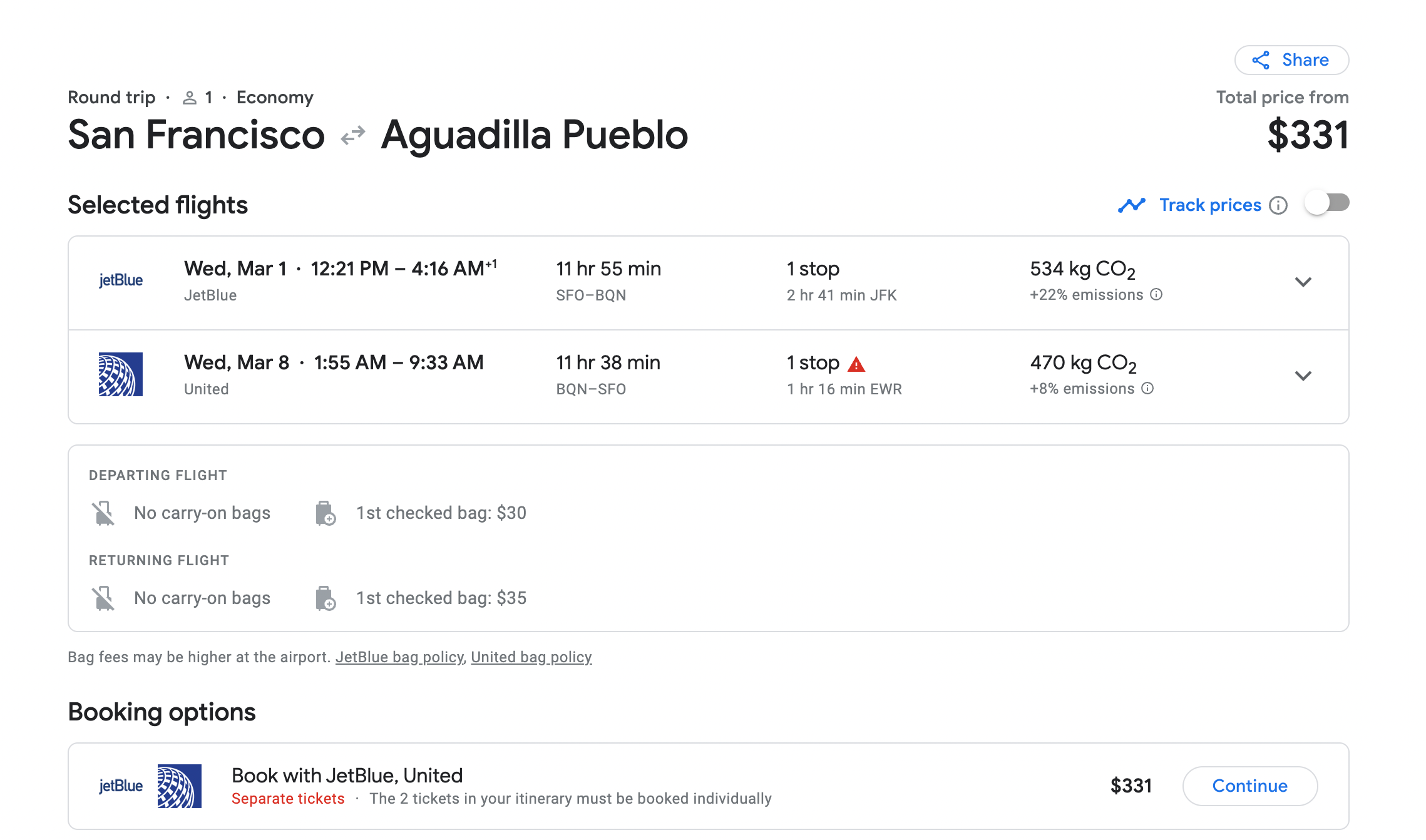 When booking your two flights separately, we recommend making sure you book one right after the other so the prices add up. In this case, if you look through JetBlue's and United's websites, the individual fares to and from Aguadilla Pueblo add up to around $331. JetBlue has one-way tickets to Aguadilla Pueblo starting at $185, and United has tickets back to San Francisco for as low as $146 (if you book basic economy with both airlines).