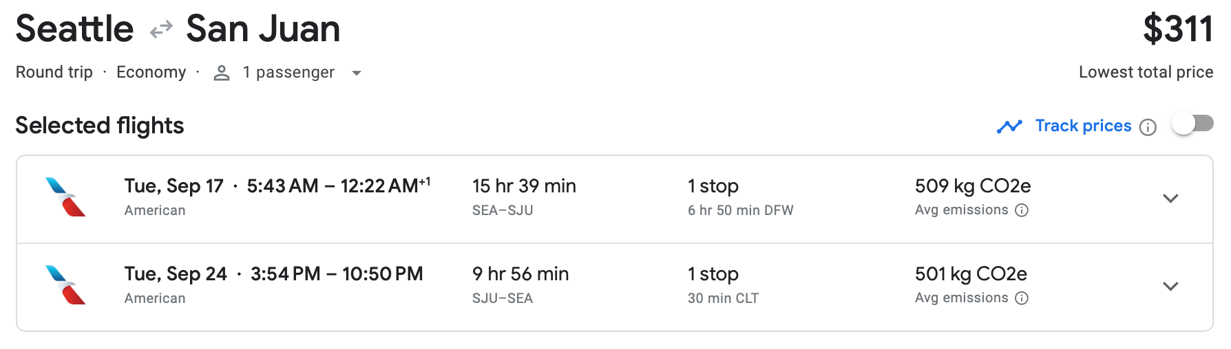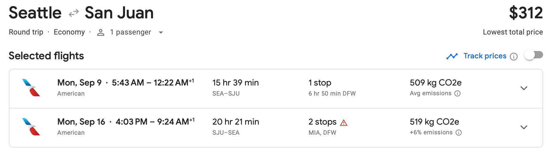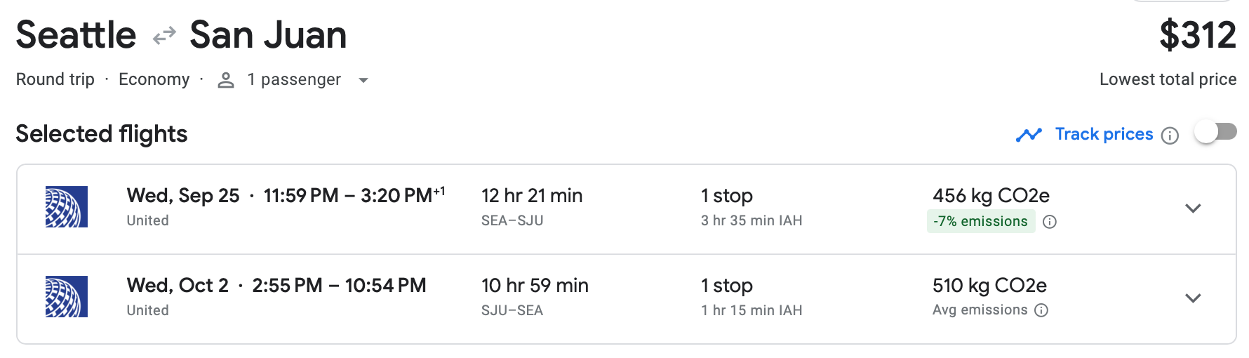 United has a Seattle-to-San Juan itinerary in late September for the same $312 round-trip price. Don't forget that with United, you'll have to pay to check your luggage.