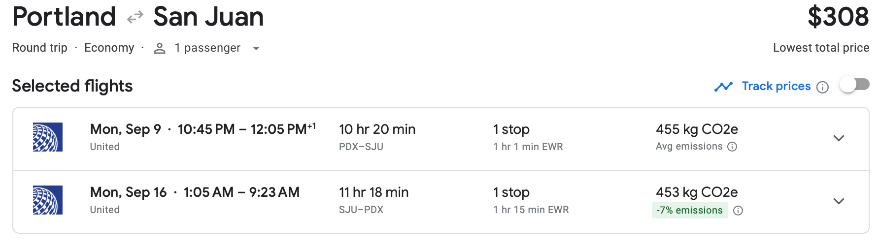 Finally, we found a couple — just a couple — of round-trip tickets from Portland to San Juan on United in early September for just $308. That's an excellent price, and judging by the fact that availability was drying up as I searched for flights, other bargain shoppers agree.