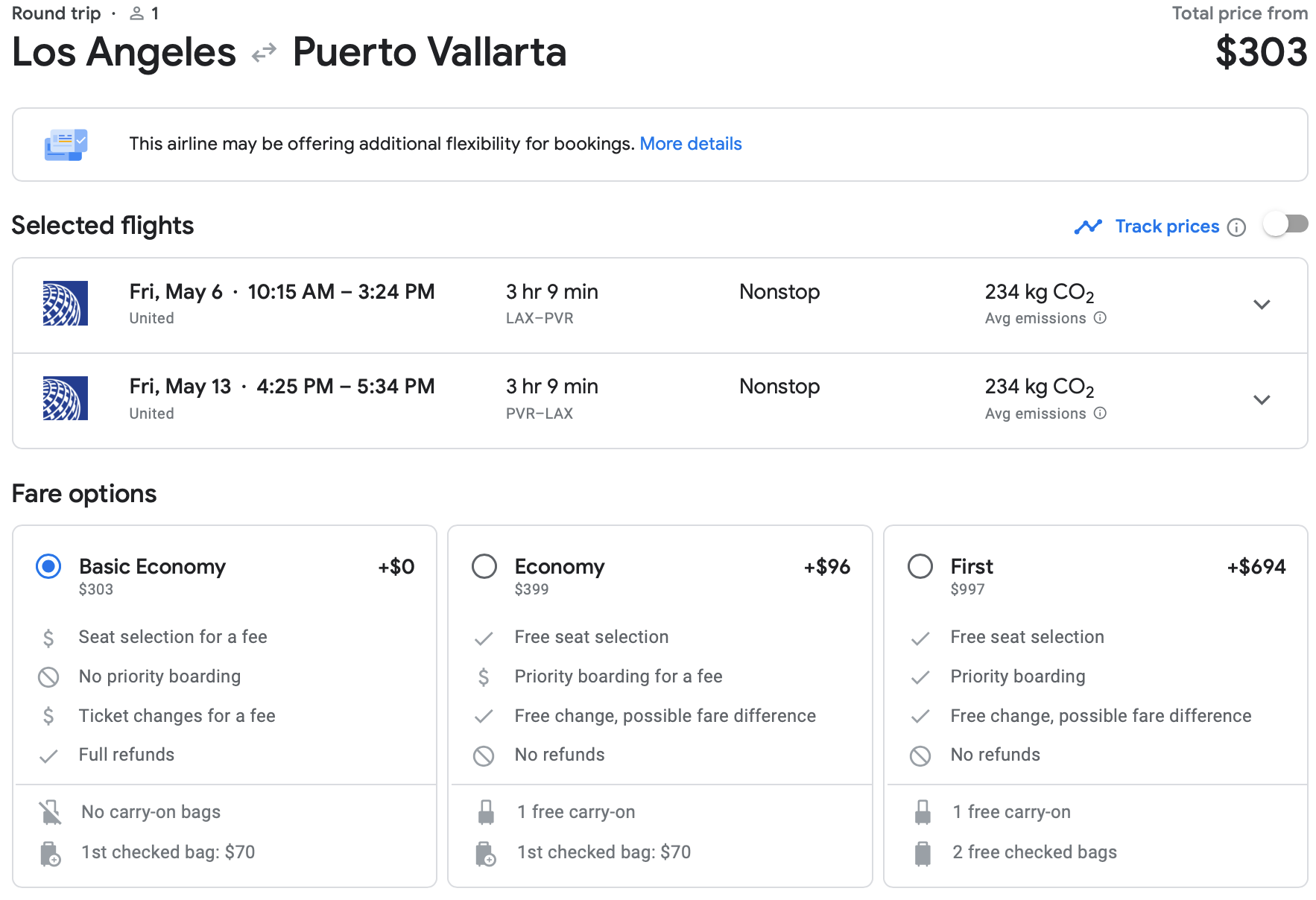 One of the better deals we found in May was for a nonstop on United from Los Angeles International Airport (LAX) to Puerto Vallarta International Airport (PVR) for only $303 round-trip. That's a pretty good price for this route, but keep in mind United's Basic Economy only provides for a free carry-on. A checked bag will cost you $70.