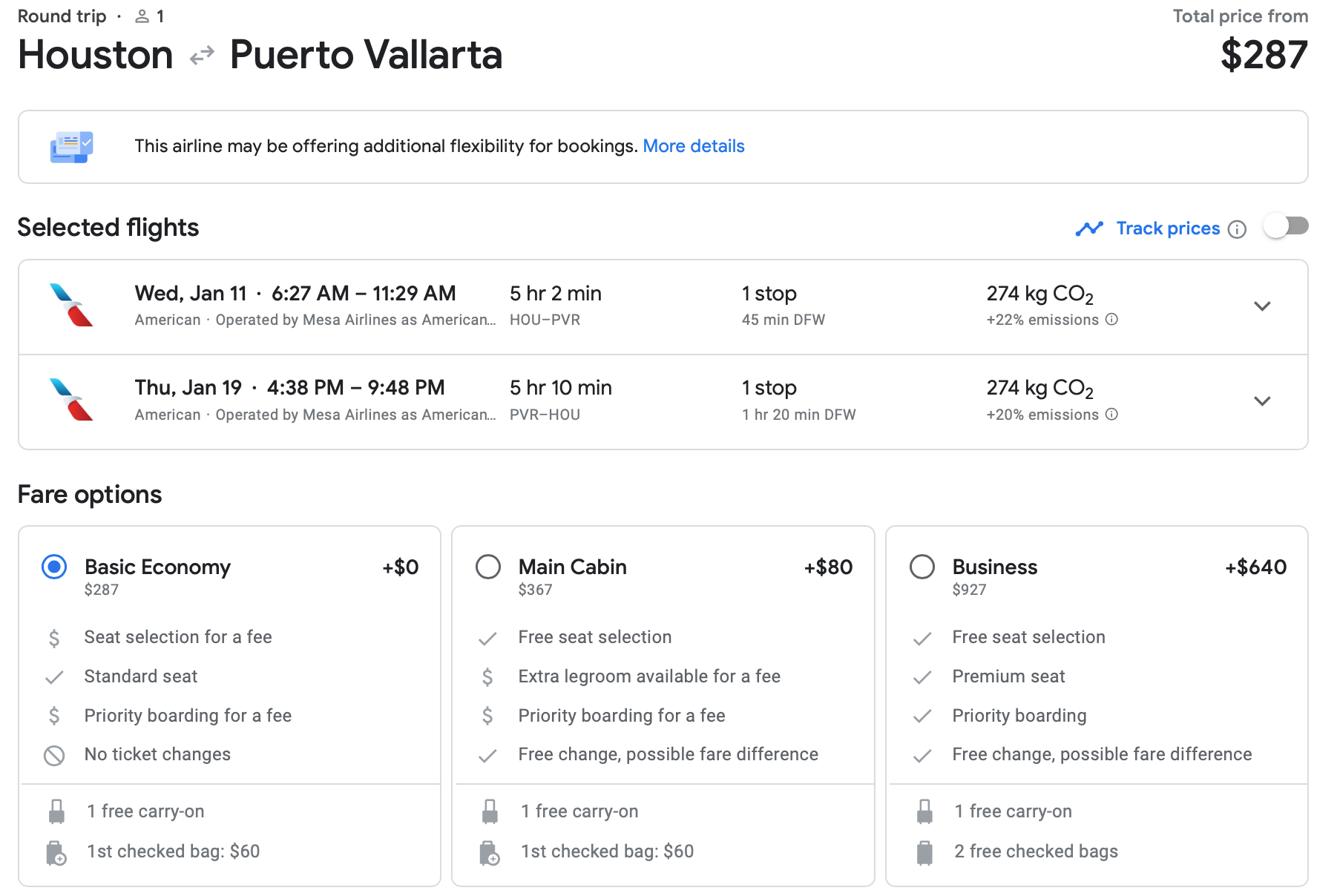 We also like this particular fare we found from the William P. Hobby Airport (HOU) for January on American that costs just $287 round-trip. It has a brief layover in Dallas-Fort Worth each way. This tier ticket comes with a free carry-on bag.