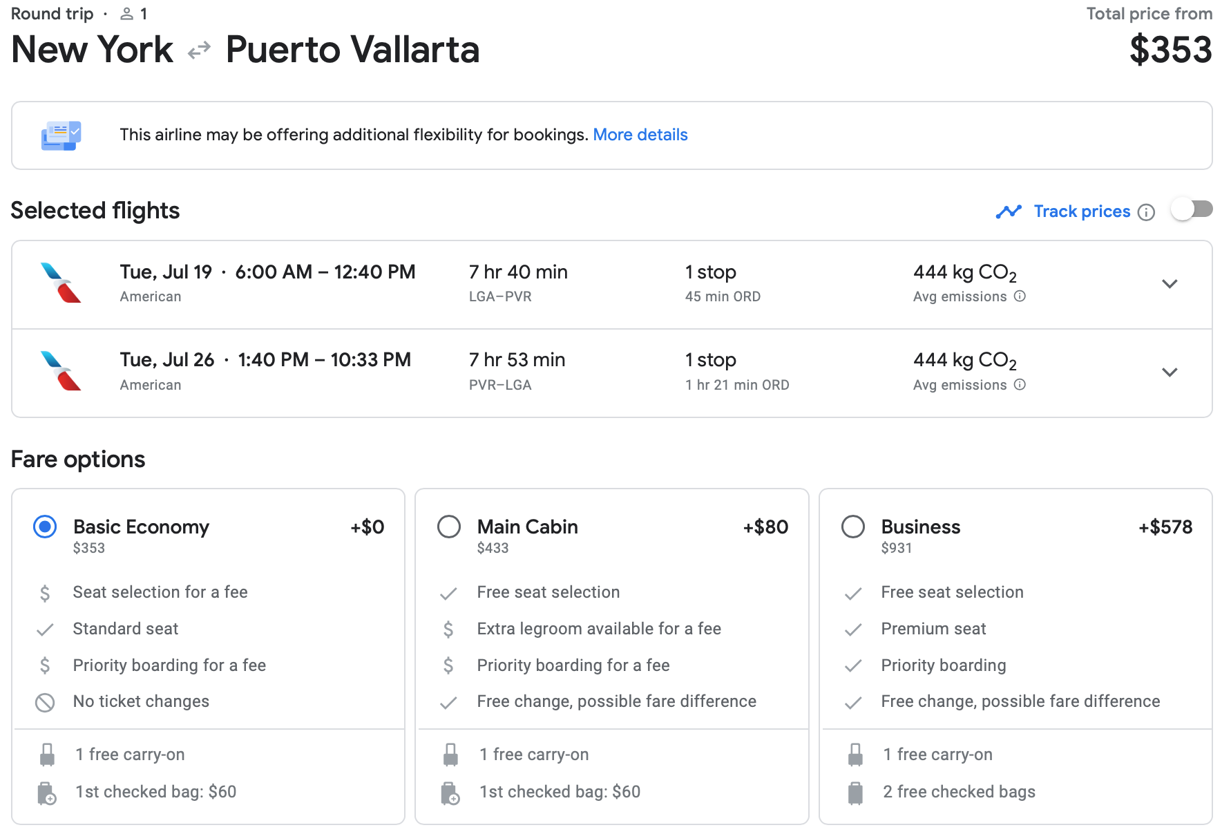 How about this? LaGuardia Airport in New York City (LGA) to Puerto Vallarta in July for only $353 round-trip. That's more than half off normal prices for this route. It's a Basic Economy ticket on American so you get the free carry-on and that's it. But that is a very nice price.