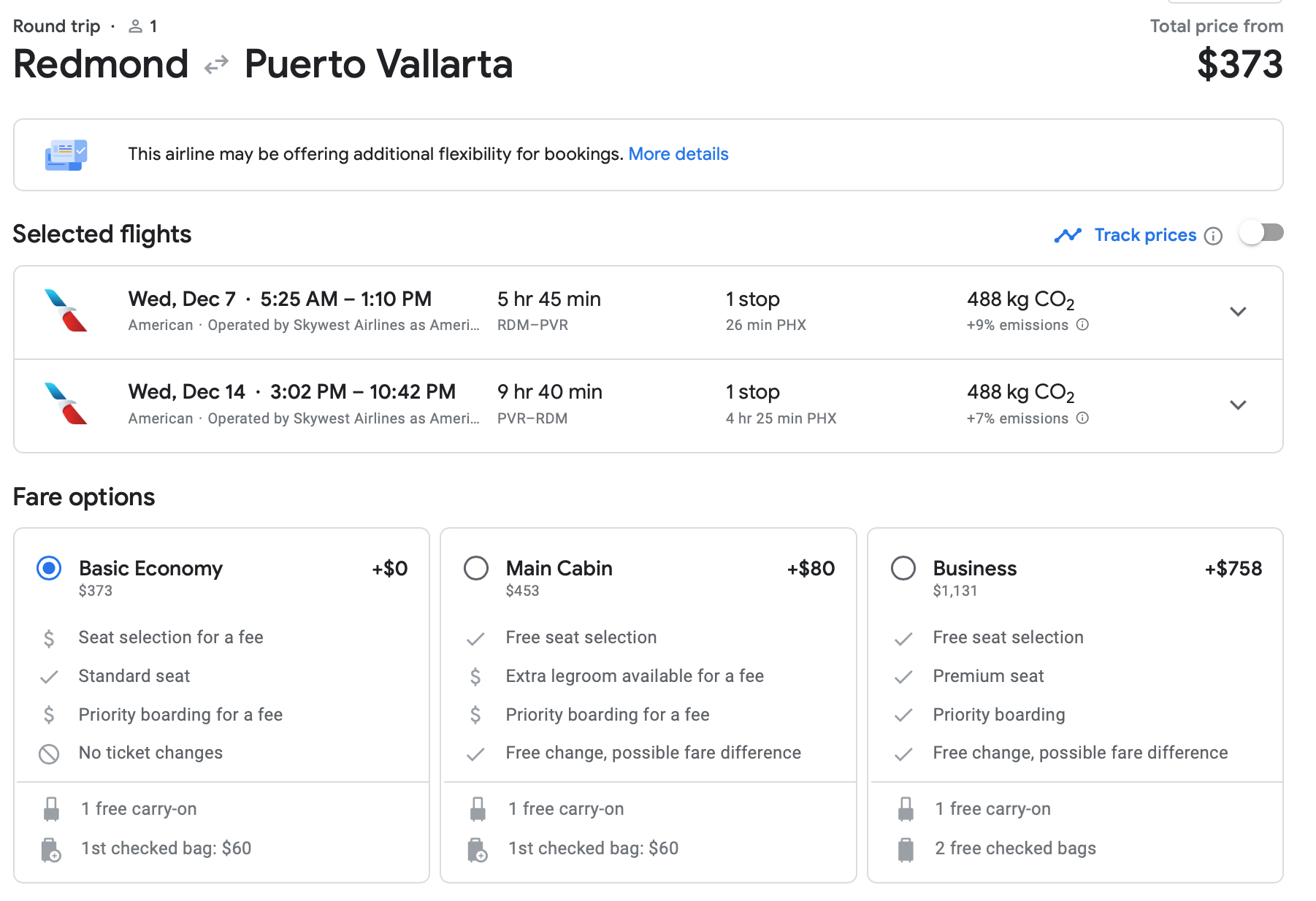 We'll end with a wildly-reduced fare from Redmond Municipal Airport (RDM) in Redmond, Oregon, to Puerto Vallarta. We found good prices throughout the fall, but this deal here for an early December flight is just crazy cheap: only $373 for a round-trip ticket that usually would cost hundreds of dollars more. Keep in mind you have a tight layover window heading to Mexico, but if you don't mind a nice sprint through the Phoenix airport, this is one of those fares that's worth the stretch.