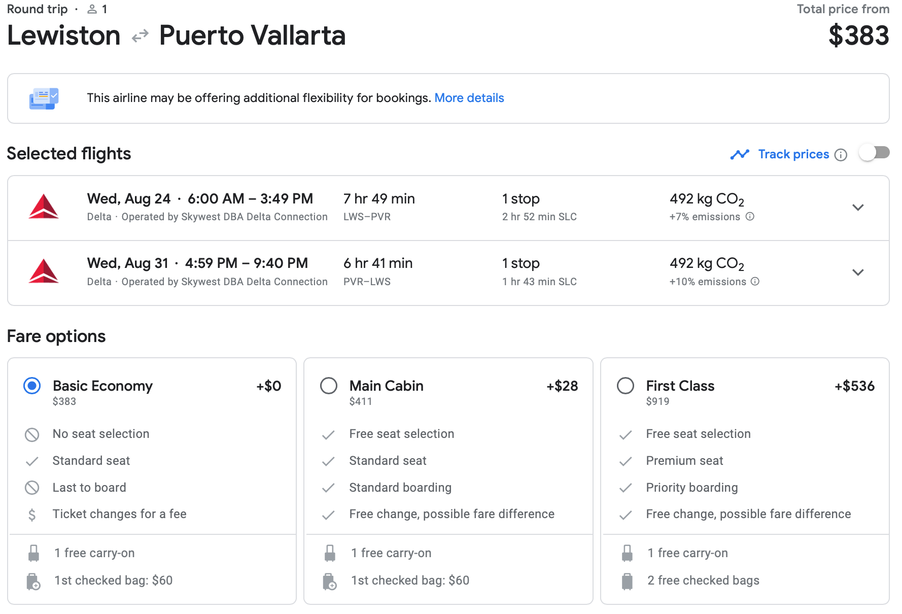 I don't get to mention Lewiston, Idaho, much in these deal alerts, so I wanted to point out that you can book flights from Lewiston-Nez Perce County Regional Airport (LWS) to Mexico for $383 round-trip on Delta in August and September. That price is for Basic Economy, and if you want to check a bag, it will cost you $60. FYI, you can upgrade to Main Cabin for just $28. You still pay for the checked bag but you get a free seat assignment and you can change your ticket without penalty.