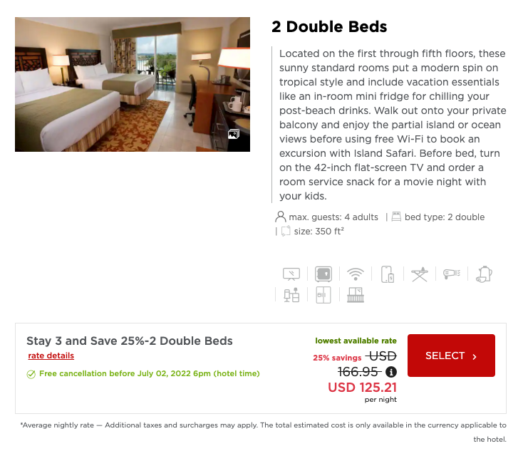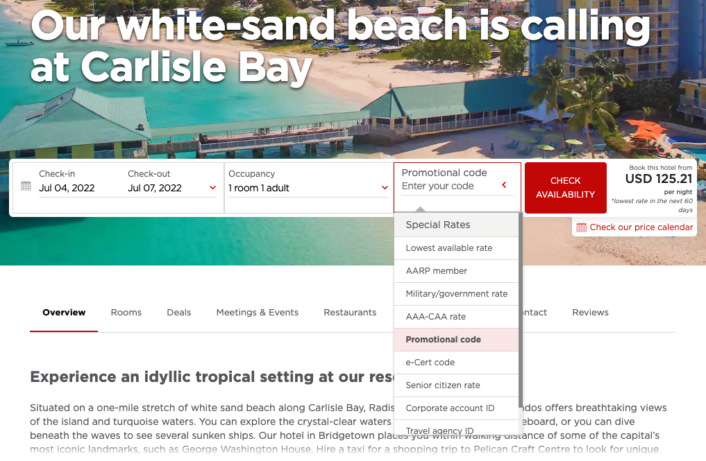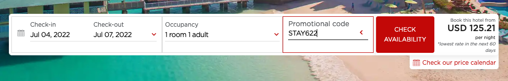When you visit the hotel's page, the first thing you should do is locate "Promotional code" in the "Special Rates" drop-down menu and enter the code STAY622. This way you'll be able to view the rates with the discount applied.