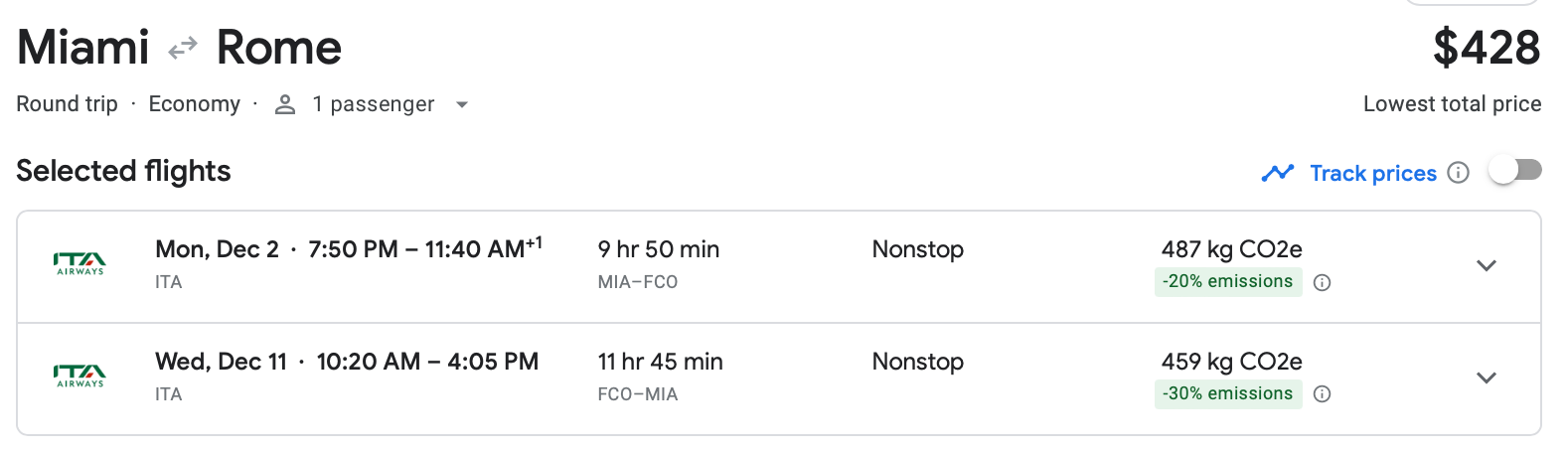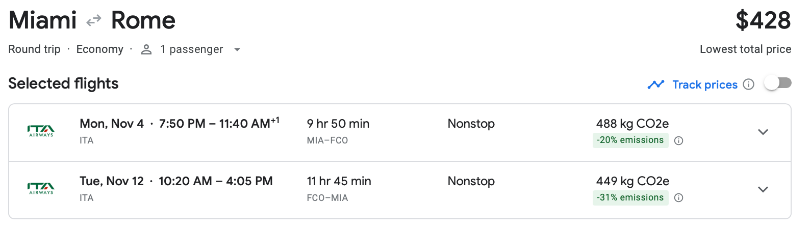 If you live in Miami, November is an excellent time to take advantage of this sale. You can fly ITA Airways nonstop from Miami International Airport (MIA) to Rome Fiumicino Leonardo da Vinci Airport (FCO) for only $428.
