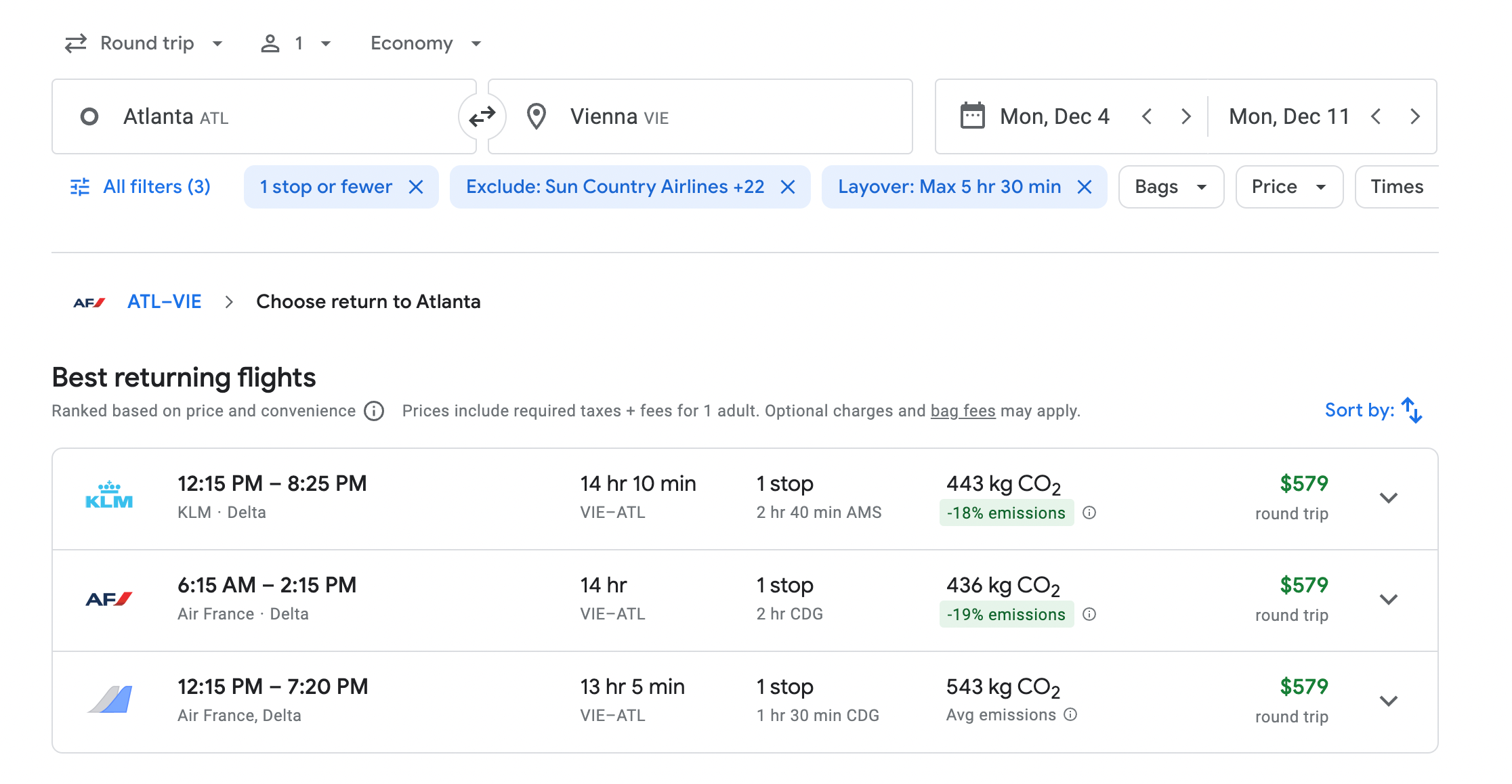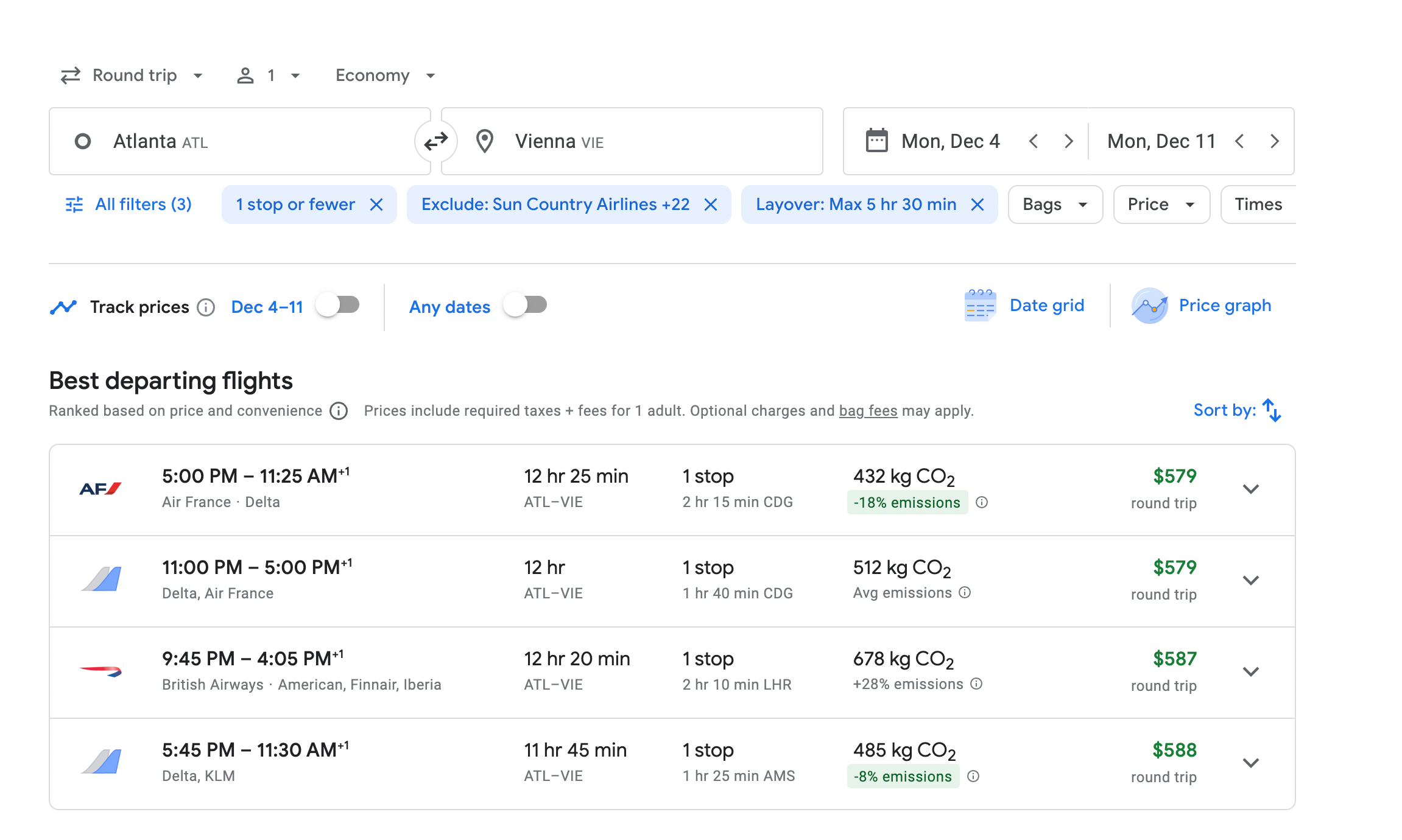 For a Dec. 4-11 trip from Atlanta to Vienna, Air France and Delta both offer flights priced at $579. The Air France flight departs at 5 p.m., and the Delta one takes off at 11 p.m. Both options include a layover in Paris.