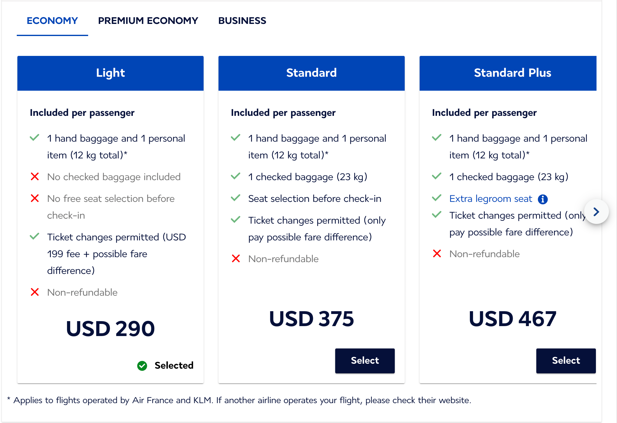 However, passengers flying with Air France's Economy Light must pay a fee for seat selection, and the fare does not include checked baggage.