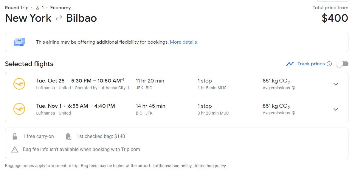 For the same $400 price, you can fly from Miami (MIA) to Bilbao (BIO) roundtrip at the beginning of November.