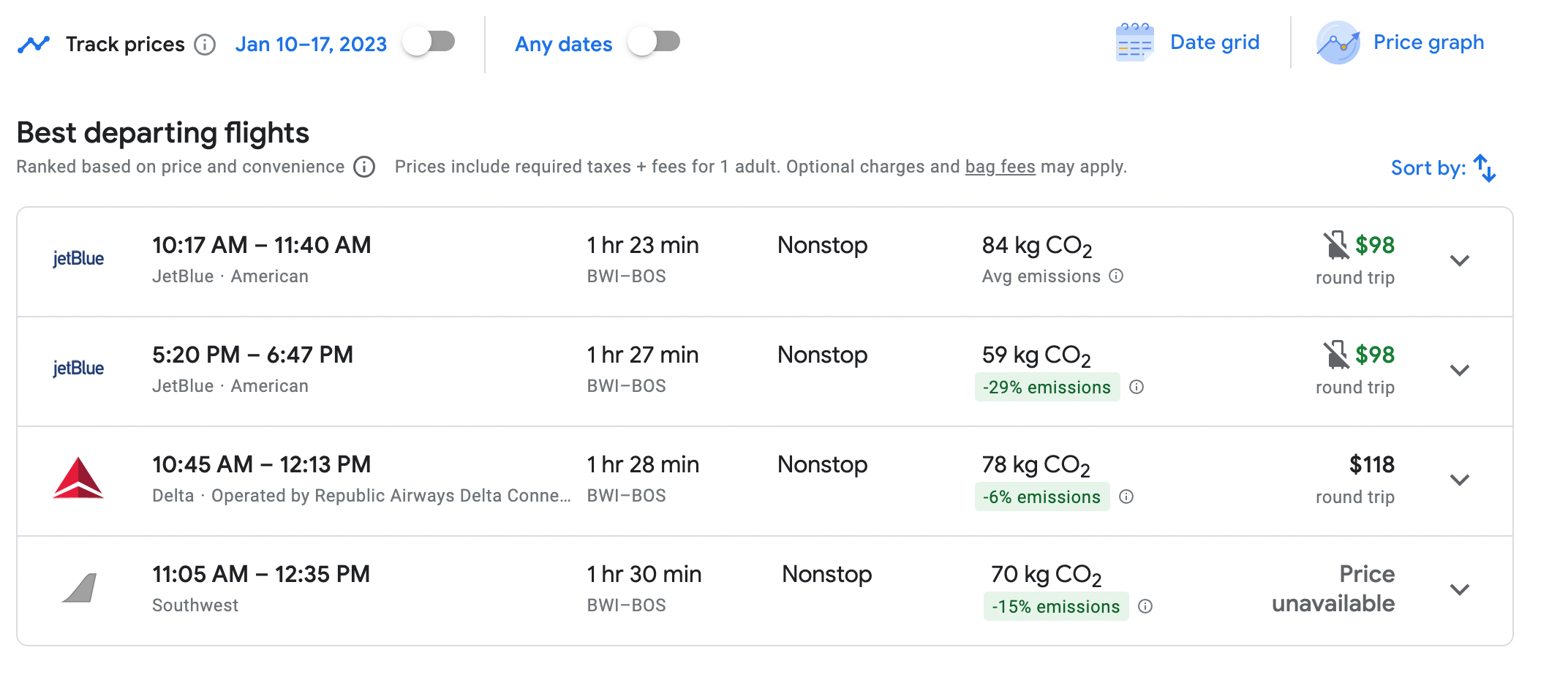 For a Jan. 10 flight from Baltimore, Google Flights shows that a $98 JetBlue flight departing at 10:17 a.m. is the lowest possible fare. Delta also offers a slightly more expensive flight to Boston from Baltimore at $118.