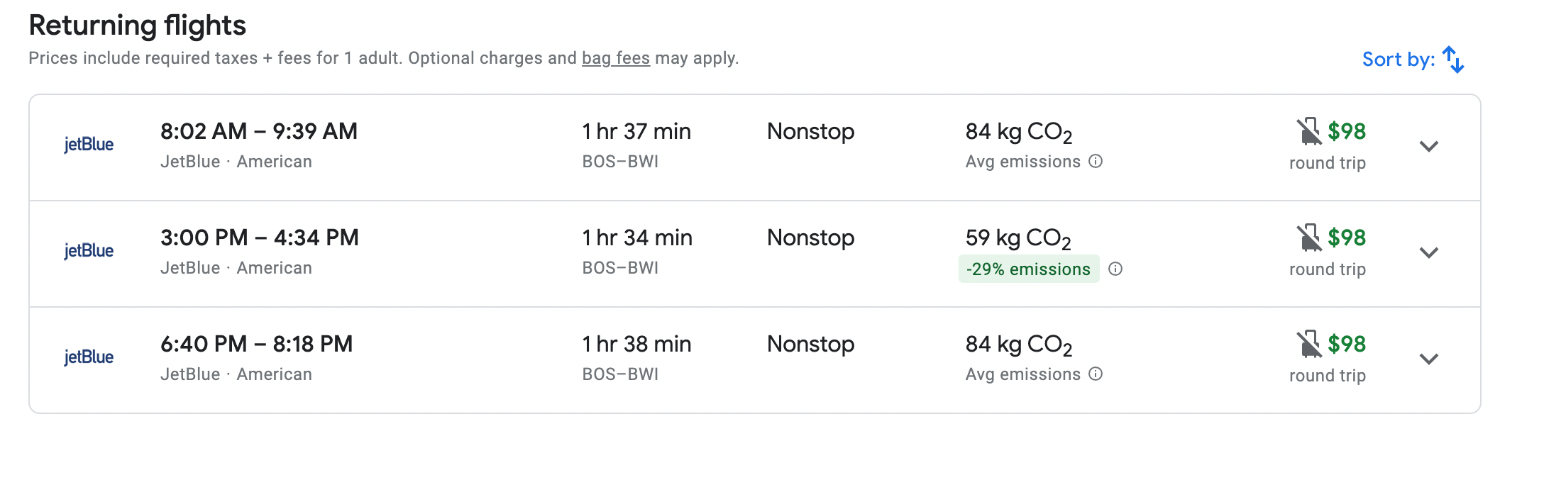 As for returning flights, JetBlue shows three flights for $98 from Boston.