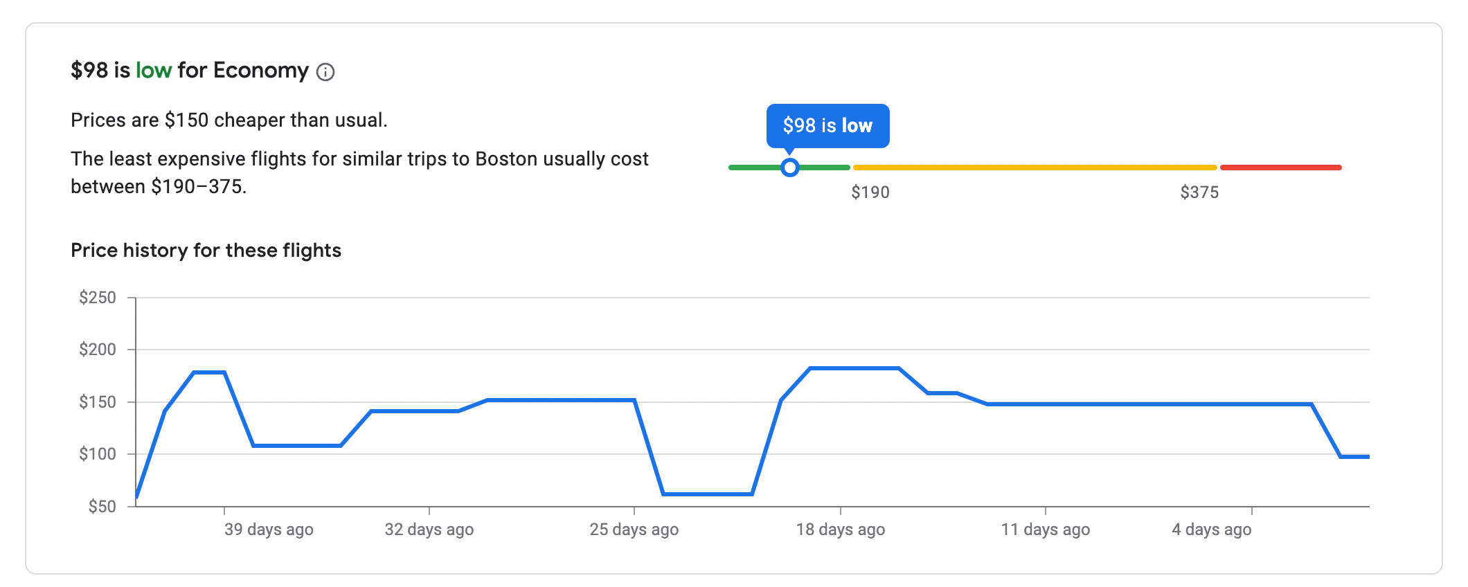 A round-trip flight from Baltimore to Boston for under $100 is ranked as low, according to Google Flights. The lowest possible fares to Boston typically range from $190 to $375.