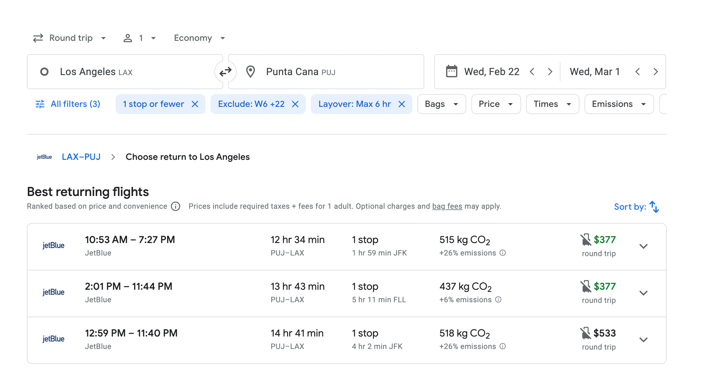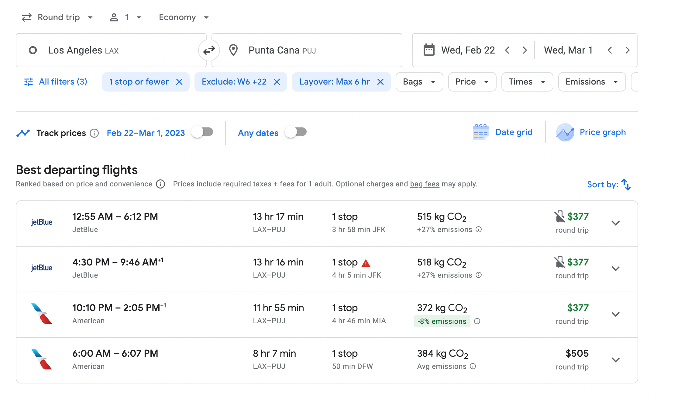 For a Feb. 22 flight to Punta Cana from Los Angeles, American and JetBlue have some of the lowest fares available, according to Google Flights. Both airlines offer flights to Punta Cana for $377.
