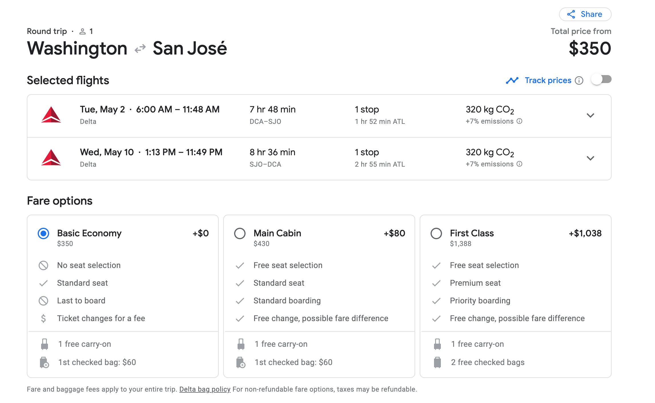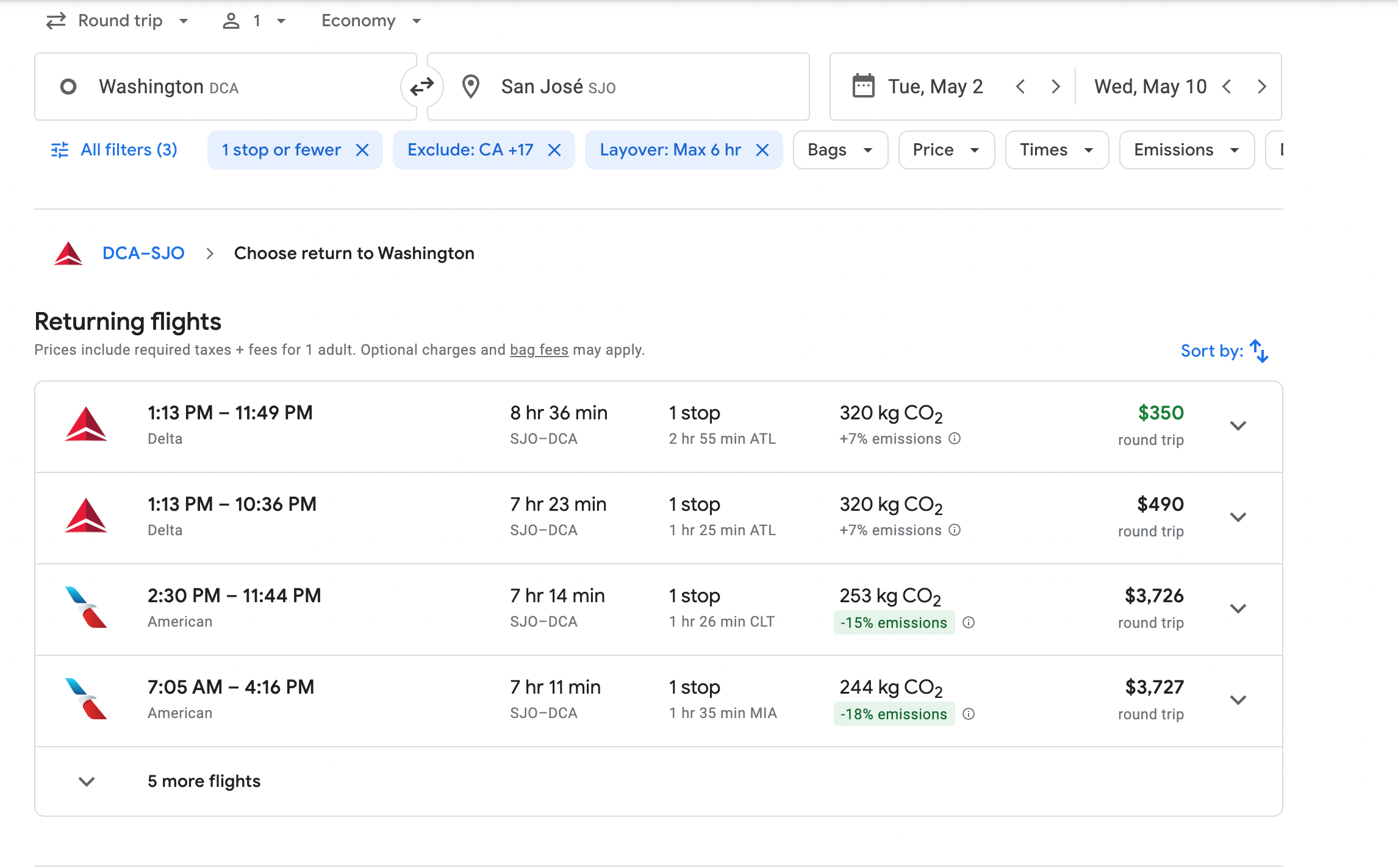 To keep the fare at $350, Delta has a return flight that leaves at 1:13 p.m. Both flights to and from San Jose have layovers in Atlanta.
