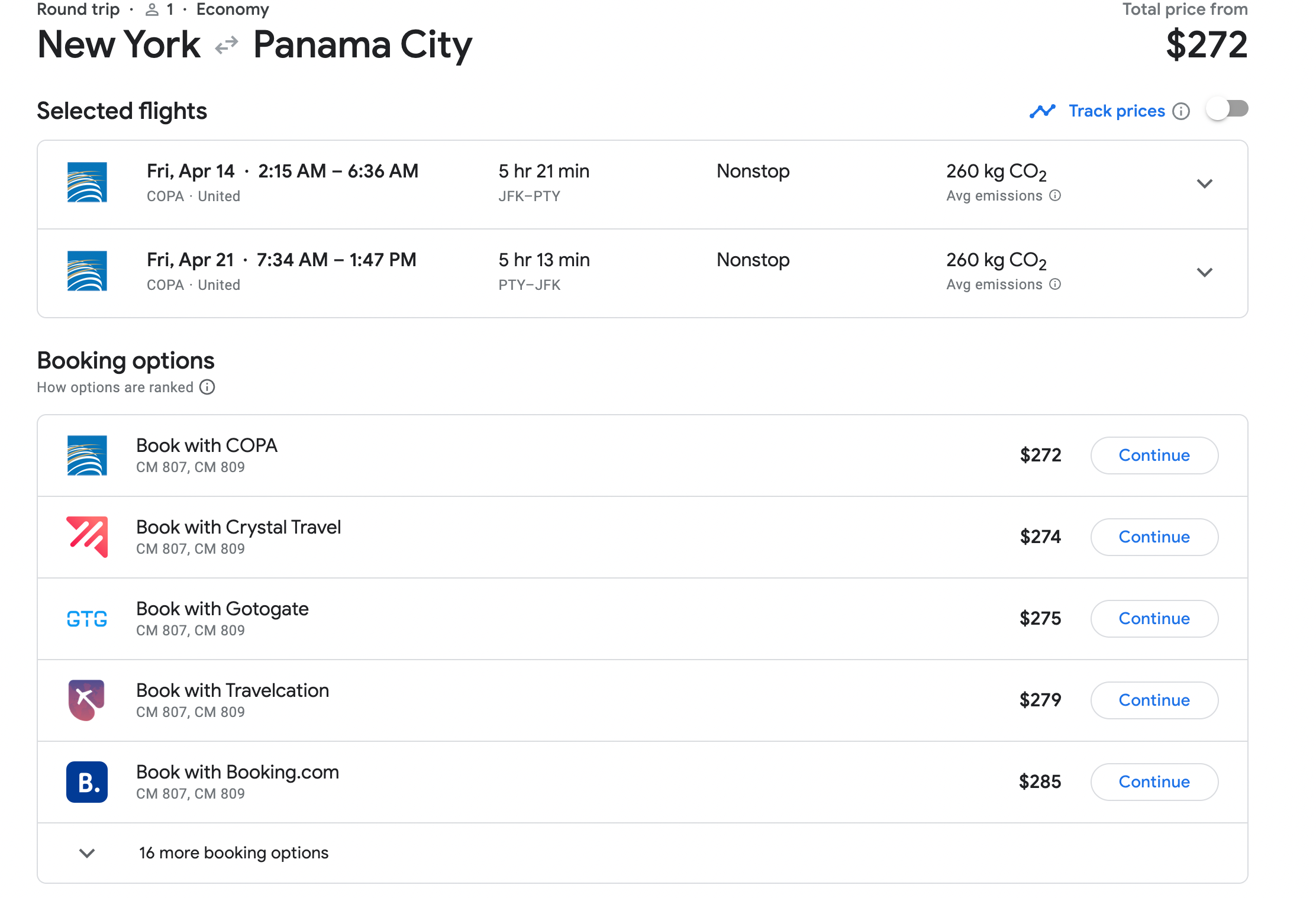 For an April 14-April 21 flight from JFK to Tocumen International Airport Panama (PTY), Google Flights shows a range of price points, with the fare from Copa Airlines being the cheapest. Fares on Google Flights tend to vary due to third-party booking options.