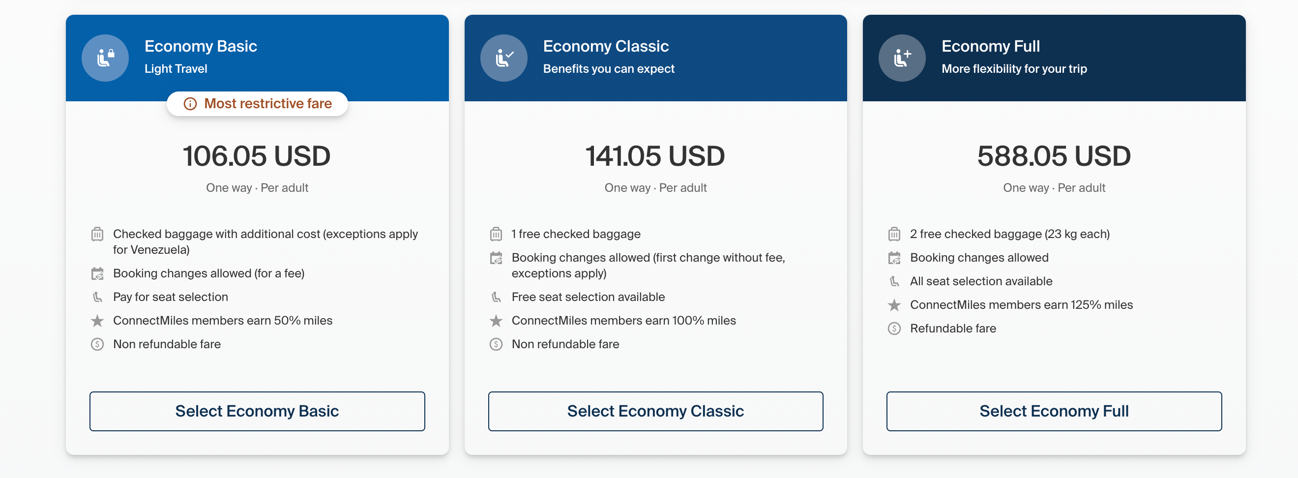Copa's economy basic has a checked baggage fee and an additional fee for seat selection. The fares are also nonrefundable and members of Copa's ConnectMiles program can only earn 50% in miles for the trip.
