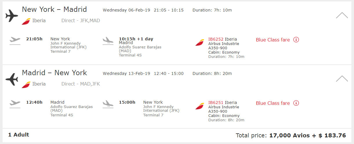 New York Kennedy (JFK) to Madrid (MAD) for 17,000 plus $184 round-trip: