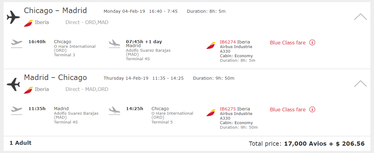 Chicago (ORD) to Madrid (MAD) for 17,000 plus $207 round-trip: