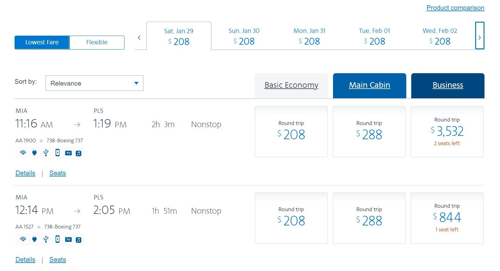 There are many available economy flights for $208 throughout January and February 2022 from MIA-PLS round-trip on American Airlines.